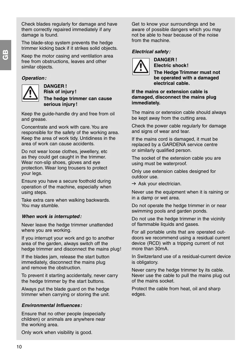 Get to know your surroundings and be aware of possible dangers which you may not be able to hear because of the noise from the machine. Electrical safety: DANGER ! VAN Electric shock! The Hedge Trimmer must not be operated with a damaged electrical cable. If the mains or extension cable is damaged, disconnect the mains plug immediately. The mains or extension cable should always be kept away from the cutting area. Check the power cable regularly for damage and signs of wear and tear. If the mains cord is damaged, it must be replaced by a GARDENA service centre or similarly qualified person. The socket of the extension cable you are using must be waterproof. Oniy use extension cables designed for outdoor use. — Ask your electrician. Never use the equipment when it is raining or in a damp or wet area. Do not operate the hedge trimmer in or near swimming pools and garden ponds. Do not use the hedge trimmer in the vicinity of flammable liquids and gases. For all portable units that are operated out- doors we recommend using a residual current device (RCD) with a tripping current of not more than 30mA. In Switzerland use of a residual-current device is obligatory. Never carry the hedge trimmer by its cable. Never use the cable to pull the mains plug out of the mains socket. Protect the cable from heat, oil and sharp edges.