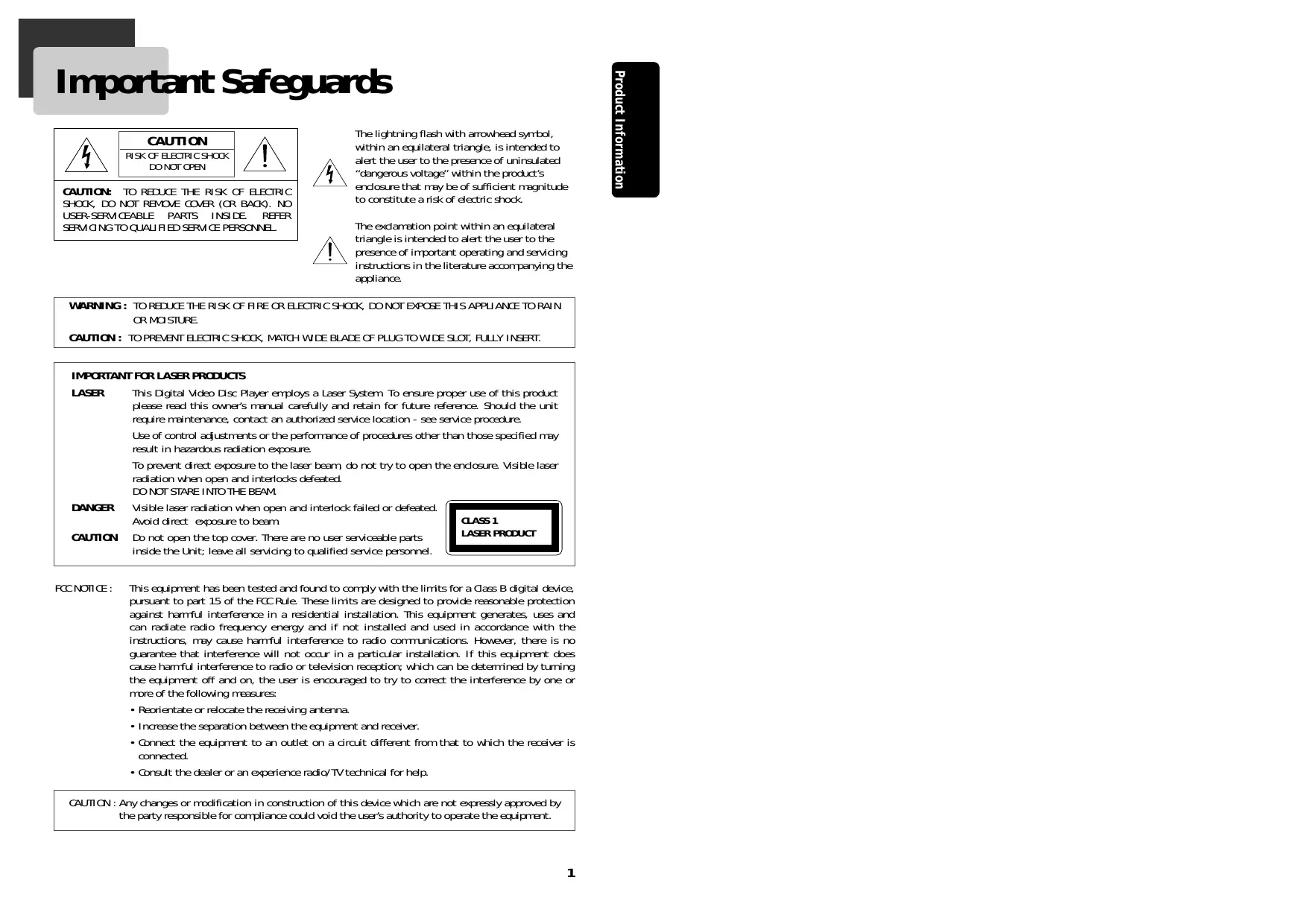LASER This Digital Mdeo Disc Player enploys à Laser System To ensure proper use of this product plesse read this onners menual crefuly and retain for future reference. Shoud the unit require maintenance, contact an authorized service location - see senice procedure. Use of control acjustrrents or the performance of procedures other than those spexified rrey resuit in hazardbus radiation exposure To prevent direct exposure to the laser beam do not try to open the endosure. Msible laser radiation when open and interlodks defested