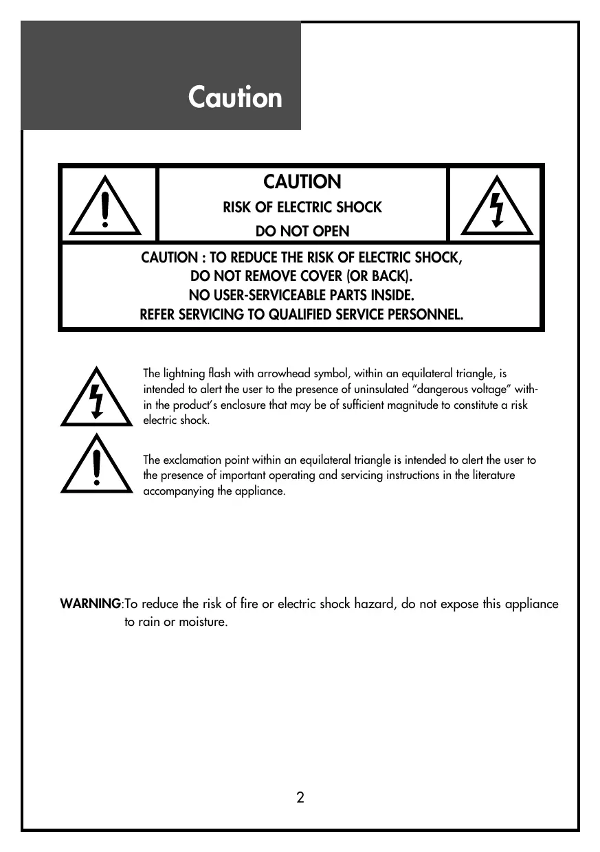 CAUTION : TO REDUCE THE RISK OF ELECTRIC SHOCK, DO NOT REMOVE COVER [OR BACK). NO USER-SERVICEABLE PARTS INSIDE. REFER SERVICING TO QUALIFIED SERVICE PERSONNEL. The lighining flash with arrowhead symbol, within an equilateral triangle, is intended to alert the user to the presence of uninsulated “dangerous voltage” with- in the products enclosure that may be of sufficient magnitude to constitute a risk electric shock. The exclamation point within an equilateral triangle is intended to alert the user to the presence of important operating and servicing instructions in the literature accompanying the appliance.