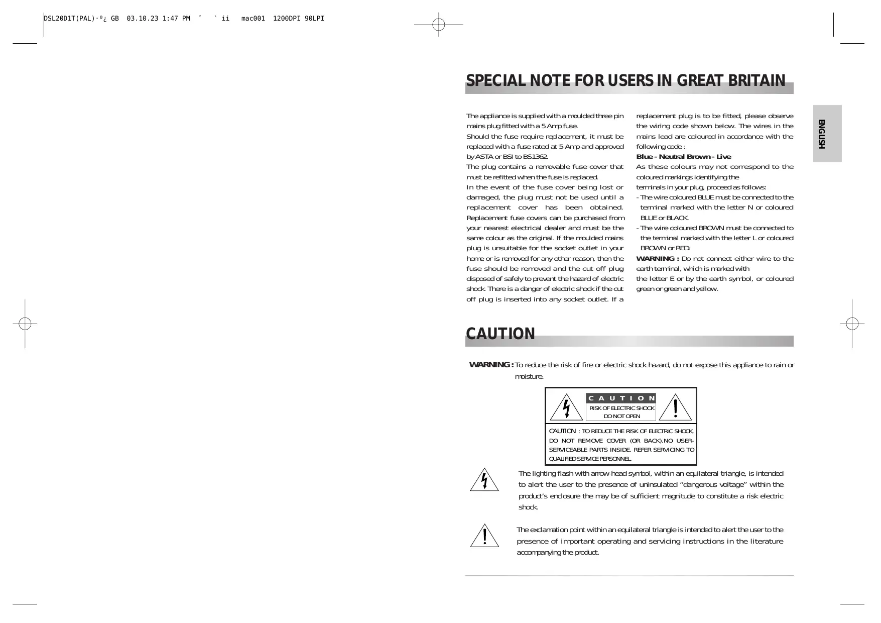 mace01 1200DPI 9OLPI SPECIAL NOTE FOR USERS IN GREAT_BRITAIN The apdianc is supplied with a rrouded three pin rairs plug fitted with a 5 Anpfiuse. Shoud the fuse require replacerrent, it must be replaced with a fLse rated at 5 Arp and approved byASTA or ES to BS1362. The plug contains à rerrovable fuse cover that met be refitted when the fuse is replaced. In the event of the fuse cover being lost or darreged, the plug must not be used until a replacement cover has been obtained. Replacerrent fuse covers can be purchesed from your nearest electrical dealer and must be the serre dar &s the original. If the mouided nains. Aug is ursuitable for the socket outlet in your borre or is removed for any ather resson, then the fuse should be rerroved and the eut off plug dsposed af safely to prevert the hazard af electric Shock There is a danger of electric shodkcif the eue off plug is inserted into any socket outiet. If a CAUTION