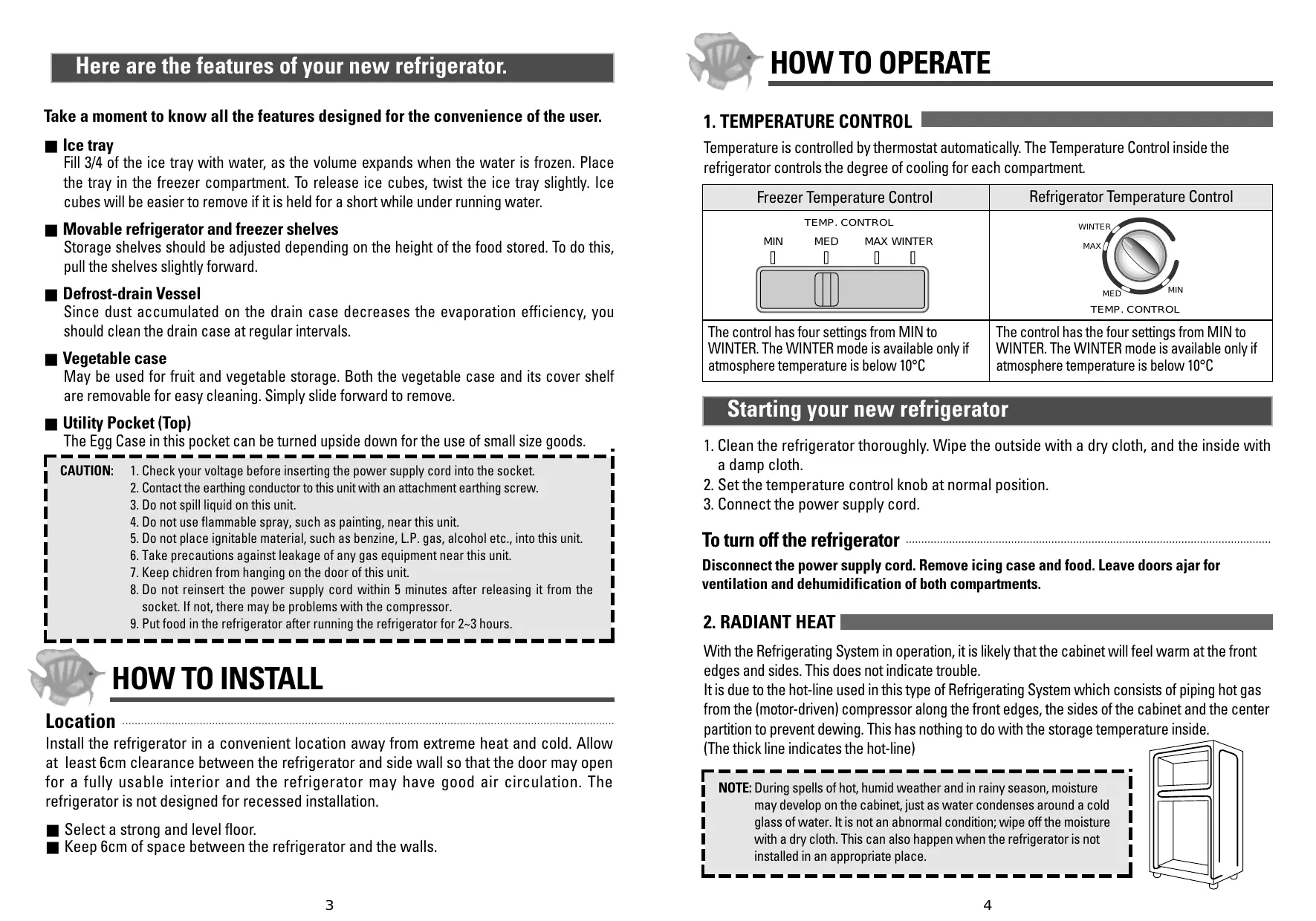 Here are the features of your new refrigerator. Take a moment to know all the features designed for the convenience of the user. M Ice tray Fill 3/4 of the ice tray with water, as the volume expands when the water is frozen. Place the tray in the freezer compartment. To release ice cubes, twist the ice tray slightly. Ice cubes will be easier to remove ifit is held for a short while under running water. & Movable refrigerator and freezer shelves Storage shelves should be adjusted depending on the height of the food stored. To do this, pull the shelves slightly forward. & Defrost-drain Vessel Since dust accumulated on the drain case decreases the evaporation efficiency, you should clean the drain case at regular intervals. M Vegetable case May be used for fruit and vegetable storage. Both the vegetable case and its cover shelf are removable for easy cleaning. Simply slide forward to remove. & Utility Pocket (Top) The Egg Case in this pocket can be turned upside down for the use of small size goods. 1 CAUTION: 1. Check your voltage before inserting the power supply cord into the socket. I 2. Contact the earthing conductor to this unit with an attachment earthing screw. 1 3. Do not spill liquid on this unit.