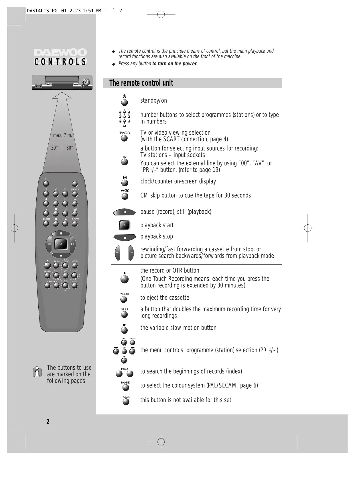 CONTROLS The buttons to use are marked on the following pages. 7 —- + The remote control is the principle means of control, but the main playback and record functions are also available on the front of the machine. e Press any button to turn on the power. The remote control unit 9 standby/on number buttons to select programmes (stations) or to type in numbers we TV or video viewing selection {with the SCART connection, page 4) a button for selecting input sources for recording: TV stations - input sockets