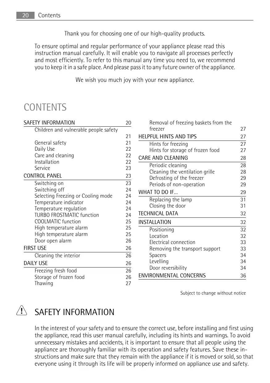 Contents Thank you for choosing one of our high-quality products. To ensure optimal and regular performance of your appliance please read this instruction manual carefully. It will enable you to navigate all processes perfectly and most efficiently. To refer to this manual any time you need to, we recommend you to keep it in a safe place. And please pass it to any future owner of the appliance. We wish you much joy with your new appliance. CONTENTS SAFETY INFORMATION Children and vulnerable people safety General safety Daily Use Care and cleaning Installation Service CONTROL PANEL Switching on Switching off Selecting Freezing or Cooling mode Temperature indicator Temperature regulation TURBO FROSTMATIC function COOLMATIC function High temperature alarm High temperature alarm Door open alarm FIRST USE Cleaning the interior DAILY USE Freezing fresh food Storage of frozen food Thawing