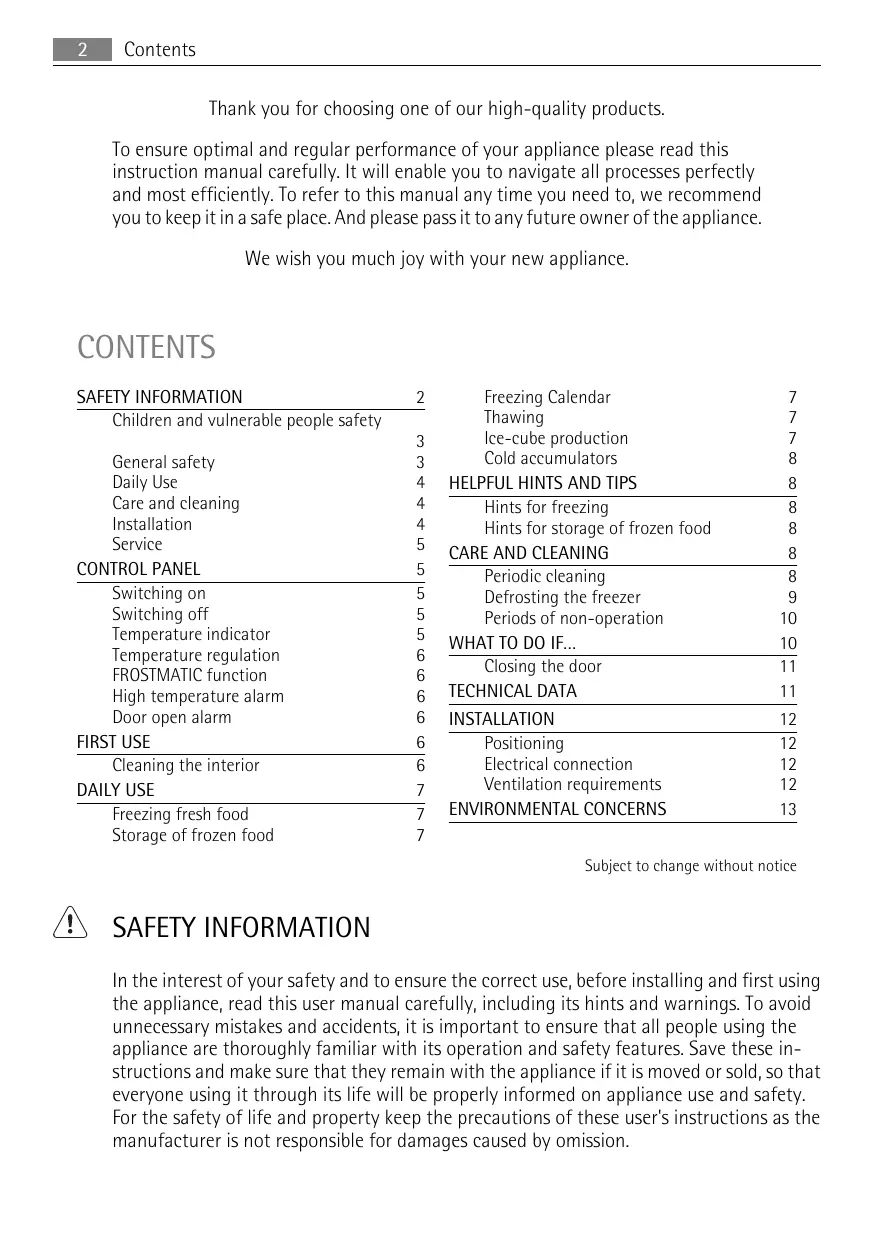 Contents Thank you for choosing one of our high-quality products. To ensure optimal and regular performance of your appliance please read this instruction manual carefully. It will enable you to navigate all processes perfectly and most efficiently. To refer to this manual any time you need to, we recommend you to keep it in a safe place. And please pass it to any future owner of the appliance. We wish you much joy with your new appliance. CONTENTS SAFETY INFORMATION Children and vulnerable people safety General safety Daily Use Care and cleaning Installation Service CONTROL PANEL Switching on Switching off Temperature indicator Temperature regulation FROSTMATIC function High temperature alarm Door open alarm FIRST USE Cleaning the interior DAILY USE Freezing fresh food Storage of frozen food