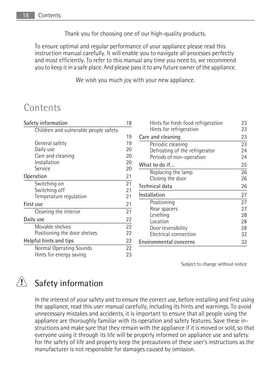 Contents Thank you for choosing one of our high-quality products. To ensure optimal and regular performance of your appliance please read this instruction manual carefully. It will enable you to navigate all processes perfectly and most efficiently. To refer to this manual any time you need to, we recommend you to keep it in a safe place. And please pass it to any future owner of the appliance. We wish you much joy with your new appliance. Contents Safety information Children and vulnerable people safety General safety Daily use Care and cleaning Installation Service Operation Switching on Switching off Temperature regulation First use Cleaning the interior Daily use Movable shelves Positioning the door shelves Helpful hints and tips Normal Operating Sounds Hints for energy saving