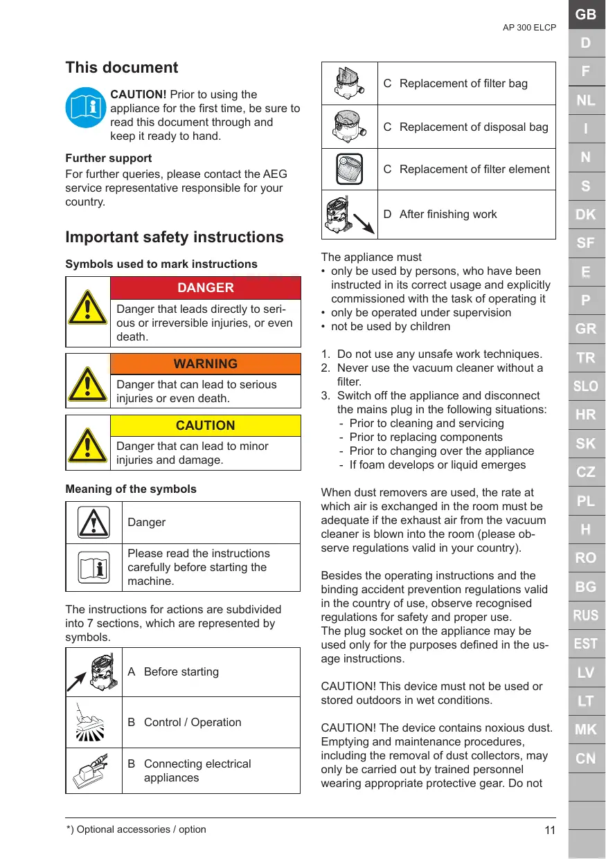 Option / Optional accessories AP 300 ELCP This document CAUTION! Prior to using the appliance for the first time, be sure to read this document through and keep it ready to hand. Further support For further queries, please contact the AEG service representative responsible for your country. DANGER Danger that leads directly to serious or irreversible injuries, or even death. WARNING Danger that can lead to serious injuries or even death. CAUTION Danger that can lead to minor injuries and damage. Meaning of the symbols Danger Please read the instructions carefully before starting the machine. The instructions for actions are subdivided into 7 sections, which are represented by symbols. A Before starting B Control / Operation B Connecting electrical appliances *) Optional accessories / option
