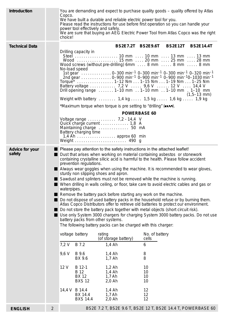 POWERBASE 60 Voltage range . . . . . . . . . . . . . 7,2 - 14,4 V Quick charge current . . . . . . . . . . . . . 1,8 A Maintaining charge . . . . . . . . . . . . . . 50 mA Battery charging time 1,4 Ah . . . . . . . . . . . . . . . . . . approx 60 min Weight . . . . . . . . . . . . . . . . . . . . . . . . 490 g Please pay attention to the safety instructions in the attached leaflet! Dust that arises when working on material containing asbestos or stonework containing crystalline silicic acid is harmful to the health. Please follow accident prevention regulations. Always wear goggles when using the machine. It is recommended to wear gloves, sturdy non slipping shoes and apron. Sawdust and splinters must not be removed while the machine is running. When drilling in walls ceiling, or floor, take care to avoid electric cables and gas or waterpipes. Remove the battery pack before starting any work on the machine. Do not dispose of used battery packs in the household refuse or by burning them. Atlas Copco Distributors offer to retrieve old batteries to protect our environment. Do not store the battery pack together with metal objects (short circuit risk). Use only System 3000 chargers for charging System 3000 battery packs. Do not use battery packs from other systems. The following battery packs can be charged with this charger: Advice for your safety voltage battery