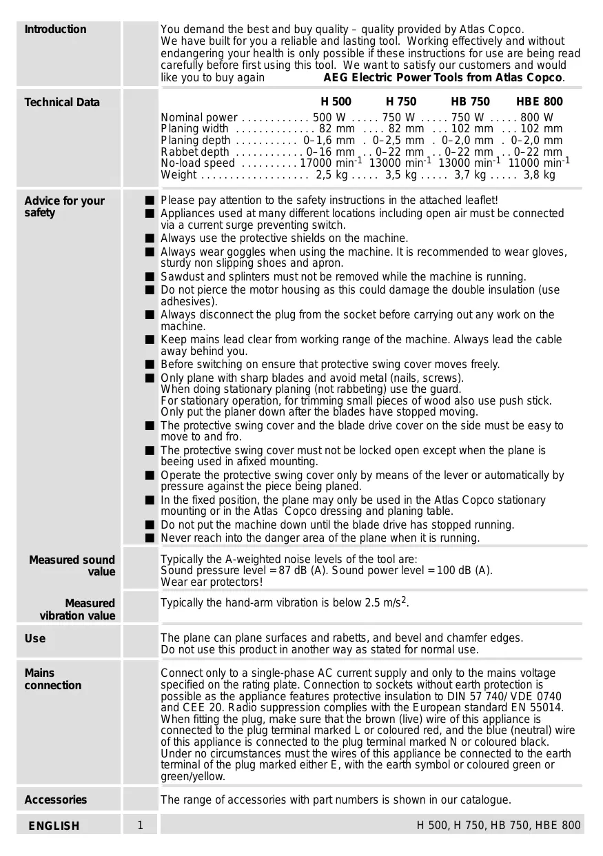 - ,7 kg ,8 kg Please pay attention to the safety instructions in the attached leaflet! Appliances used at many different locations including open air must be connected via a current surge preventing switch. Always use the protective shields on the machine. Always wear goggles when using the machine. It is recommended to wear gloves, sturdy non slipping shoes and apron. Sawdust and splinters must not be removed while the machine is running. Do not pierce the motor housing as this could damage the double insulation (use adhesives). Always disconnect the plug from the socket before carrying out any work on the machine. Keep mains lead clear from working range of the machine. Always lead the cable away behind you. Before switching on ensure that protective swing cover moves freely. Only plane with sharp blades and avoid metal (nails, screws). When doing stationary planing (not rabbeting) use the guard. For stationary operation, for trimming small pieces of wood also use push stick. Only put the planer down after the blades have stopped moving. The protective swing cover and the blade drive cover on the side must be easy to move to and fro. The protective swing cover must not be locked open except when the plane is beeing used in afixed mounting. Operate the protective swing cover only by means of the lever or automatically by pressure against the piece being planed. In the fixed position, the plane may only be used in the Atlas Copco stationary mounting or in the Atlas Copco dressing and planing table. Do not put the machine down until the blade drive has stopped running. Never reach into the danger area of the plane when it is running. Advice for your safety Typically the A-weighted noise levels of the tool are: Sound pressure level = 87 dB (A). Sound power level = 100 dB (A). Wear ear protectors! Measured sound value Typically the hand-arm vibration is below 2.5 m/s2. Measured vibration value Use The plane can plane surfaces and rabetts, and bevel and chamfer edges. Do not use this product in another way as stated for normal use. Mains connection Connect only to a single-phase AC current supply and only to the mains voltage specified on the rating plate. Connection to sockets without earth protection is possible as the appliance features protective insulation to DIN 57 740/ VDE 0740 and CEE 20. Radio suppression complies with the European standard EN 55014. When fitting the plug, make sure that the brown (live) wire of this appliance is connected to the plug terminal marked L or coloured red, and the blue (neutral) wire of this appliance is connected to the plug terminal marked N or coloured black. Under no circumstances must the wires of this appliance be connected to the earth terminal of the plug marked either E, with the earth symbol or coloured green or green/yellow. Accessories The range of accessories with part numbers is shown in our catalogue. ENGLISH p. 3