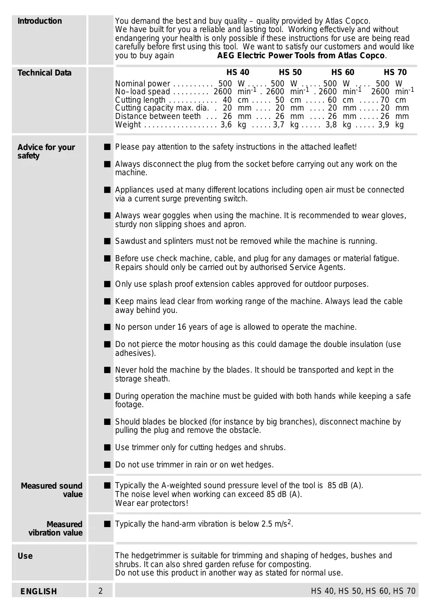 | Advice for operation | Before using the tool please read the instructions. If possible have the tool demonstrated. Always keep a safe footing and hold machine with both hands. Keep children or animals away from working area. Keep a safe distance between the blades and your body. To avoid damage to the extension cable always start work near the power supply and work away from socket, trailing the cable behind you. When working near the ground avoid earth or stones getting caught between the blades. | HS 40, HS 50, HS 60, HS 70 |