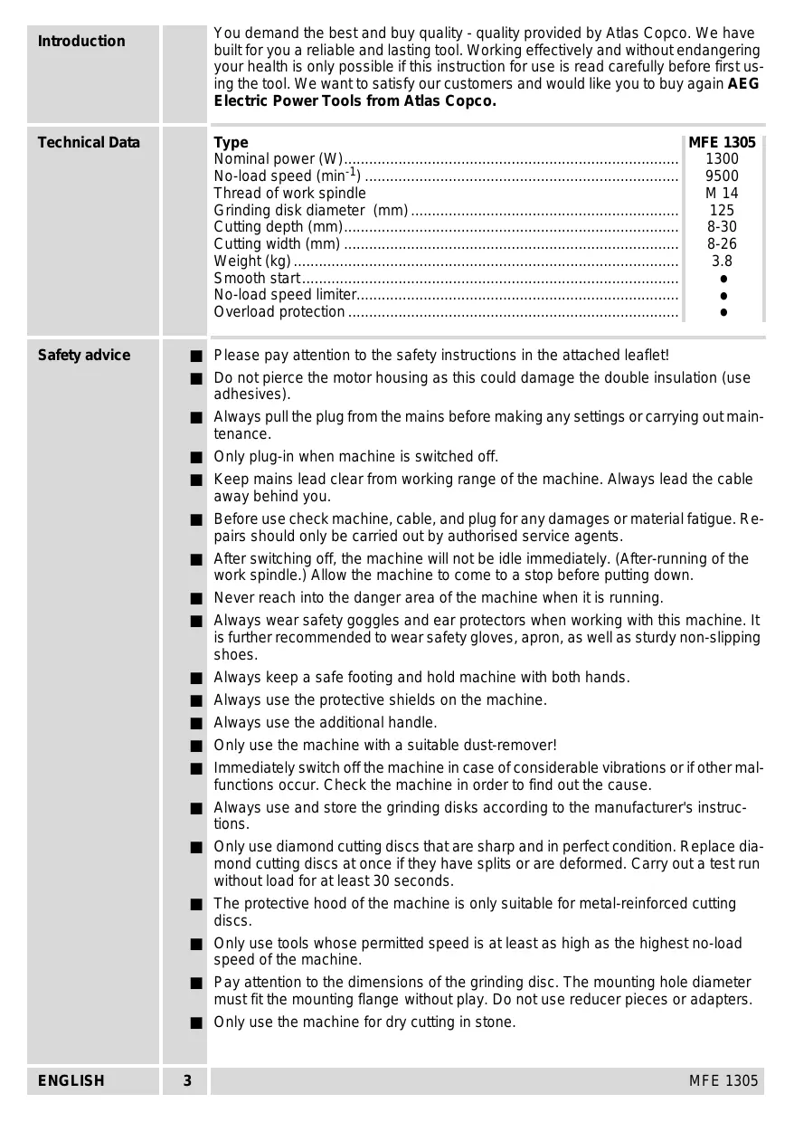 MFE 1305 Blunt diamond cutting discs are recognisable by the large number of sparks that fly during work, and can be resharpened by making a number of cuts in abrasive material (e.g. plaster). When cutting concrete or brick it is recommended to use only one diamond cutting disk, especially if large cutting depth is required. Otherwise the engine gets overloaded, and the motor protection device activates the electronic shut-off. If the load-rate motor protection switches the machine off very often, it is possible that the reason for this are power consuming materials like damp or very hard materials. In this case reduce the cutting depth or work with only one diamond cutting disc. If only one disc is fitted it is recommended to use the square between the protective hood cover and cutting support as aid for cutting. For that purpose a spacing washer must be mounted between bearing flange and diamond cutting disk (the remaining spacing washers must be mounted between diamond cutting disk and flange nut). To faciliate this a guide can be mounted to the wall. Tips Service Keep the machine and the ventilation slots clean. Use only AEG accessories and spare parts. Should components need to be replaced which have not been described, please contact one of our AEG service agents (see our list of guarantee/service addresses). If needed, an exploded view of the tool can be ordered. Please state the ten-digit No. as well as the machine type printed on the label and order the drawing at your local service agents or directly at: Atlas Copco Electric Tools GmbH, Postfach 320, D-71361 Winnenden. Accessories Please refer to page 2 for range of accessories. Further accessories with part numbers are shown in our catalogues. ENGLISH