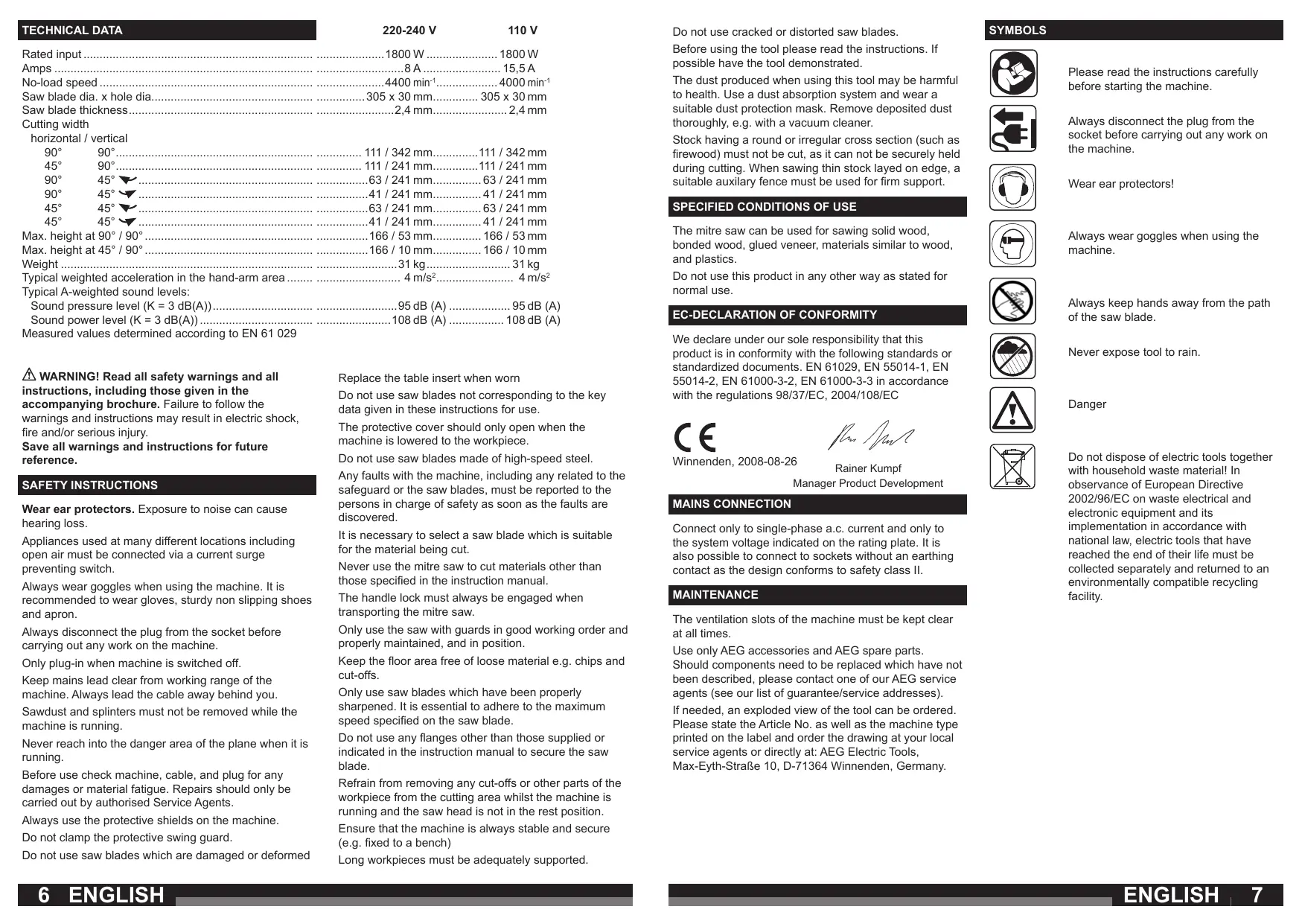 We declare under our sole responsibility that this product is in conformity with the following standards or standardized documents. EN 61029, EN 55014-1, EN 55014-2, EN 61000-3-2, EN 61000-3-3 in accordance with the regulations 98/37/EC, 2004/108/EC Always wear goggles when using the machine. Always keep hands away from the path of the saw blade. Never expose tool to rain. Danger The protective cover should only open when the machine is lowered to the workpiece. Do not use saw blades made of high-speed steel. Any faults with the machine, including any related to the safeguard or the saw blades, must be reported to the persons in charge of safety as soon as the faults are discovered. It is necessary to select a saw blade which is suitable for the material being cut. Never use the mitre saw to cut materials other than those specified in the instruction manual. The handle lock must always be engaged when transporting the mitre saw. Only use the saw with guards in good working order and properly maintained, and in position. Keep the floor area free of loose material e.g. chips and cut-offs. Only use saw blades which have been properly sharpened. It is essential to adhere to the maximum speed specified on the saw blade. Do not use any flanges other than those supplied or indicated in the instruction manual to secure the saw blade. Winnenden, 2008-08-26 Rainer Kumpf Manager Product Development MAINS CONNECTION Connect only to single-phase a.c. current and only to the system voltage indicated on the rating plate. It is also possible to connect to sockets without an earthing contact as the design conforms to safety class II. MAINTENANCE Do not dispose of electric tools together with household waste material! In observance of European Directive 2002/96/EC on waste electrical and electronic equipment and its implementation in accordance with national law, electric tools that have reached the end of their life must be collected separately and returned to an environmentally compatible recycling facility. The ventilation slots of the machine must be kept clear at all times. Use only AEG accessories and AEG spare parts. Should components need to be replaced which have not been described, please contact one of our AEG service agents (see our list of guarantee/service addresses). If needed, an exploded view of the tool can be ordered. Please state the Article No. as well as the machine type printed on the label and order the drawing at your local service agents or directly at: AEG Electric Tools, Max‑Eyth‑Straße 10, D‑71364 Winnenden, Germany. Refrain from removing any cut-offs or other parts of the workpiece from the cutting area whilst the machine is running and the saw head is not in the rest position. Ensure that the machine is always stable and secure (e.g. fixed to a bench) Long workpieces must be adequately supported. ENGLISH