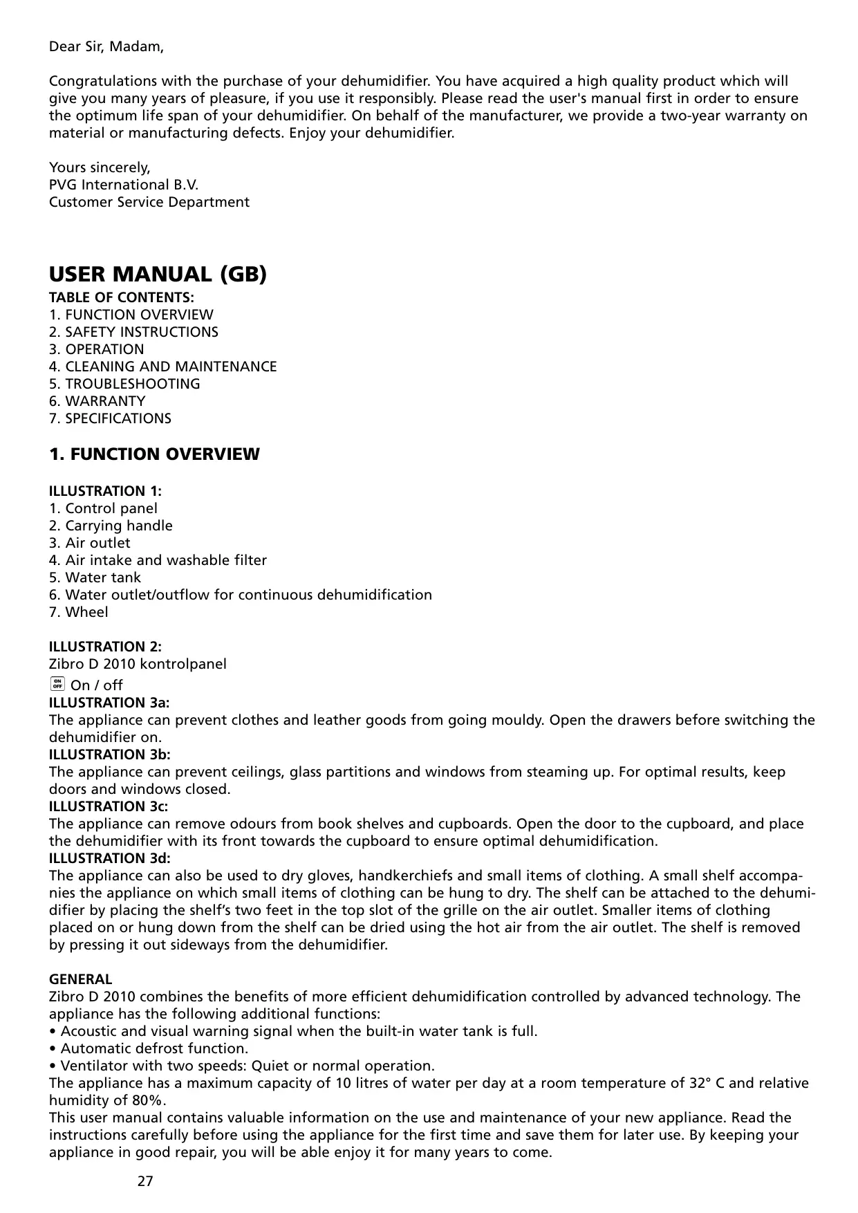 L’appareil permet d’éliminer les mauvaises odeurs des bibliothèques et des armoires. Pour une déshumidification efficace, ouvrez le meuble et placez l’appareil devant. ILLUSTRATION 3d: L’appareil peut également s’utiliser pour sécher gants, mouchoirs et autres petits vêtements. Accrochez les vêtements à sécher sur le petit étendage fourni avec l’appareil. Pour le fixer sur le déshumidificateur, placer les deux pieds de l’étendage sur la rainure située en haut de la grille de la sortie d’air. Pour sécher des vêtements de très petite taille déposés ou accrochés sur l’étendage, vous pouvez aussi utiliser la sortie d’air chaud. Pour décrocher l’étendage du déshumidificateur, appuyez sur les côtés. GÉNÉRALITÉS Zibro D 2010 assure une déshumidification très efficace grâce à une technologie avancée. L’appareil est équipé des fonctions suivantes: • Signal d’avertissement sonore et visuel lorsque le réservoir d’eau intégré est plein. • Fonction de dégel automatique. • Ventilateur à deux vitesses: silencieux ou normal. L’appareil a une capacité maximum de 10 litres d’eau par jour à une température ambiante de 32° C et à un taux d’humidité relative de 80%. Ce manuel contient des informations importantes pour l’utilisation et l’entretien de votre nouvel appareil. Lisez attentivement les instructions avant la première utilisation du déshumidificateur. Conservez le manuel pour le consulter ultérieurement. Maintenez votre appareil en bon état de fonctionnement et vous pourrez en profiter pendant de longues années.
