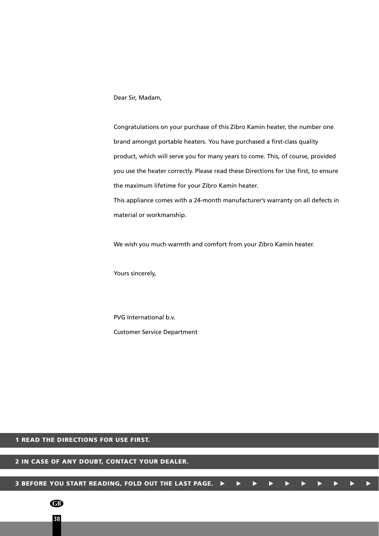 Dear Sir, Madam, Congratulations on your purchase of this Zibro Kamin heater, the number one brand amongst portable heaters. You have purchased a first-class quality product, which will serve you for many years to come. This, of course, provided you use the heater correctly. Please read these Directions for Use first, to ensure the maximum lifetime for your Zibro Kamin heater. This appliance comes with a 24-month manufacturer’s warranty on all defects in material or workmanship. We wish you much warmth and comfort from your Zibro Kamin heater. Yours sincerely, PVG International b.v. Customer Service Department 1 READ THE DIRECTIONS FOR USE FIRST. 2 IN CASE OF ANY DOUBT, CONTACT YOUR DEALER. 3 BEFORE YOU START READING, FOLD OUT THE LAST PAGE.