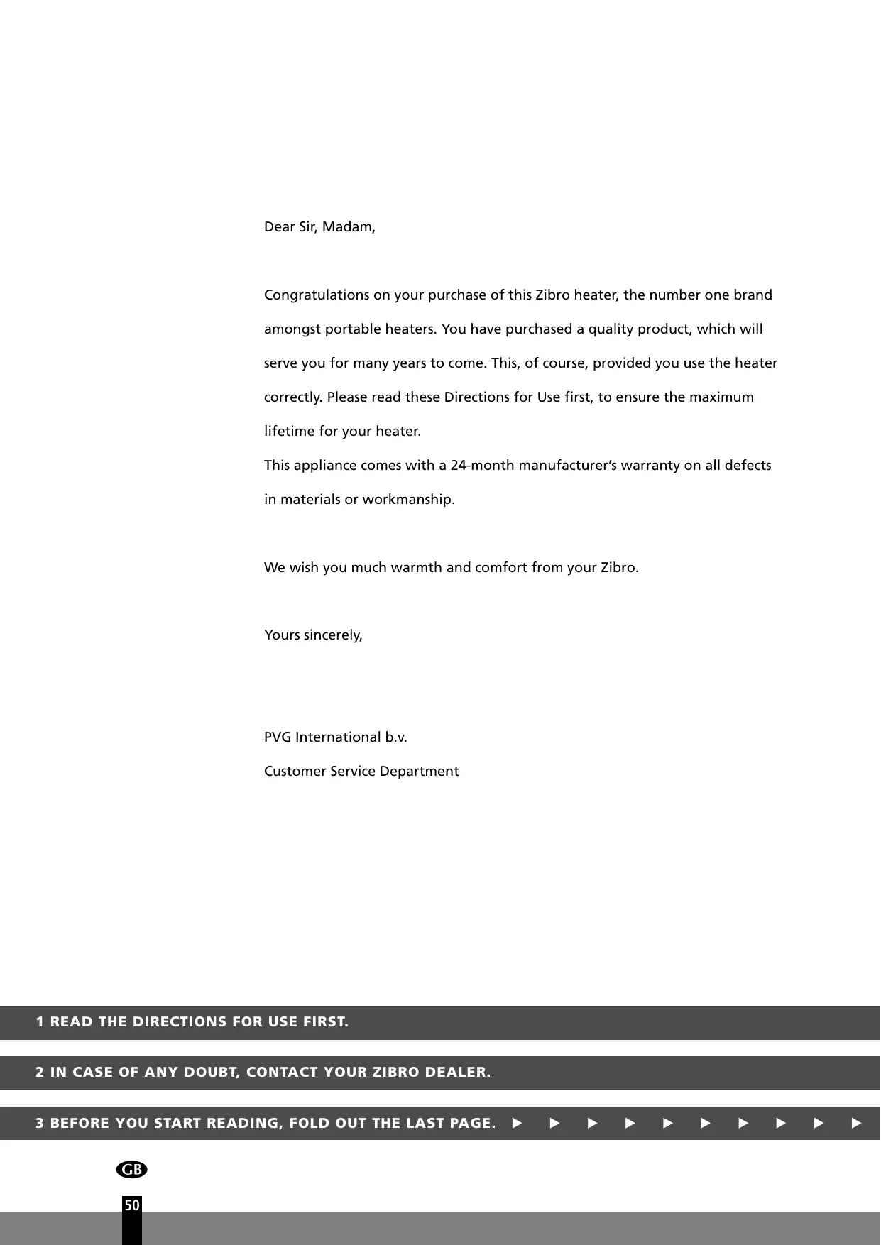 Dear Sir, Madam, Congratulations on your purchase of this Zibro heater, the number one brand amongst portable heaters. You have purchased a quality product, which will serve you for many years to come. This, of course, provided you use the heater correctly. Please read these Directions for Use first, to ensure the maximum lifetime for your heater. This appliance comes with a 24-month manufacturer’s warranty on all defects in materials or workmanship. We wish you much warmth and comfort from your Zibro. Yours sincerely, PVG International b.v. Customer Service Department 1 READ THE DIRECTIONS FOR USE FIRST. 2 IN CASE OF ANY DOUBT, CONTACT YOUR ZIBRO DEALER. 3 BEFORE YOU START READING, FOLD OUT THE LAST PAGE.