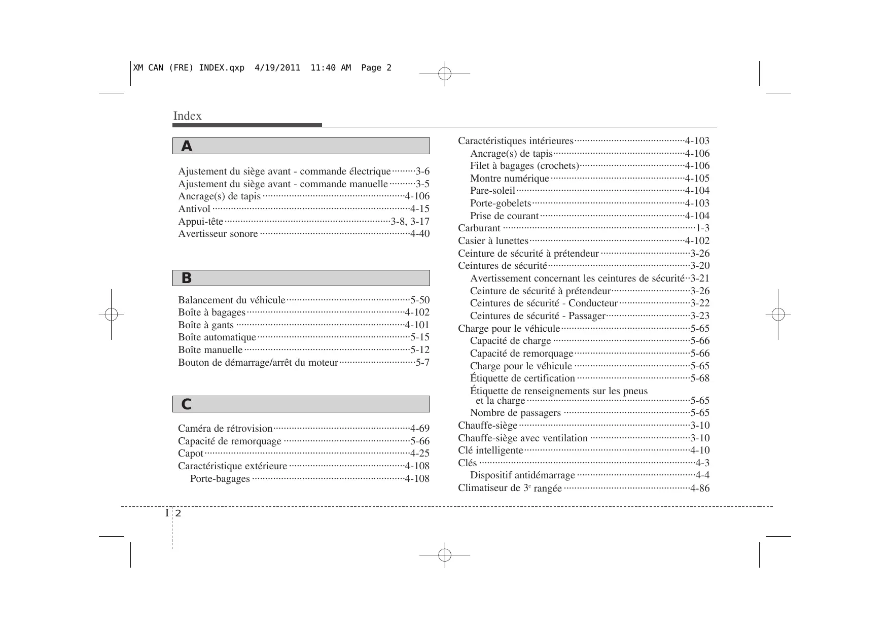 Caméra de rétrovision····················································4-69 Capacité de remorquage ················································5-66 Capot··············································································4-25 Caractéristique extérieure ············································4-108 Porte-bagages ··························································4-108 I 2 Caractéristiques intérieures··········································4-103 Ancrage(s) de tapis··················································4-106 Filet à bagages (crochets)········································4-106 Montre numérique···················································4-105 Pare-soleil································································4-104 Porte-gobelets··························································4-103 Prise de courant ·······················································4-104 Carburant ·········································································1-3 Casier à lunettes···························································4-102 Ceinture de sécurité à prétendeur ··································3-26 Ceintures de sécurité······················································3-20 Avertissement concernant les ceintures de sécurité··3-21 Ceinture de sécurité à prétendeur······························3-26 Ceintures de sécurité - Conducteur ···························3-22 Ceintures de sécurité - Passager································3-23 Charge pour le véhicule·················································5-65 Capacité de charge ····················································5-66 Capacité de remorquage············································5-66 Charge pour le véhicule ············································5-65 Étiquette de certification ···········································5-68 Étiquette de renseignements sur les pneus et la charge ······························································5-65 Nombre de passagers ················································5-65 Chauffe-siège ·································································3-10 Chauffe-siège avec ventilation ······································3-10 Clé intelligente·······························································4-10 Clés ··················································································4-3 Dispositif antidémarrage ·············································4-4 Climatiseur de 3e rangée ················································4-86 XM CAN (FRE) INDEX.qxp 4/19/2011 11:40 AM Page 3 Index Commandes de radio au volant ···································4-110 Compartiment-moteur ··············································2-4, 7-2 Compte-tours ·································································4-51 Compteur kilométrique··················································4-54 Compteur kilométrique/Totalisateur partiel/ Ordinateur de route ···················································4-53 Conditions dangereuses ·················································5-48 Balancement du véhicule ··········································5-50 Conditions dangereuses·············································5-48 Conduire dans la pluie ··············································5-51 Conduire dans un endroit inondé ······························5-52 Conduire la nuit·························································5-51 Négocier les virages en douceur ·······························5-50 Rouler sur l'autoroute ················································5-52 Conditions spéciales de conduite································