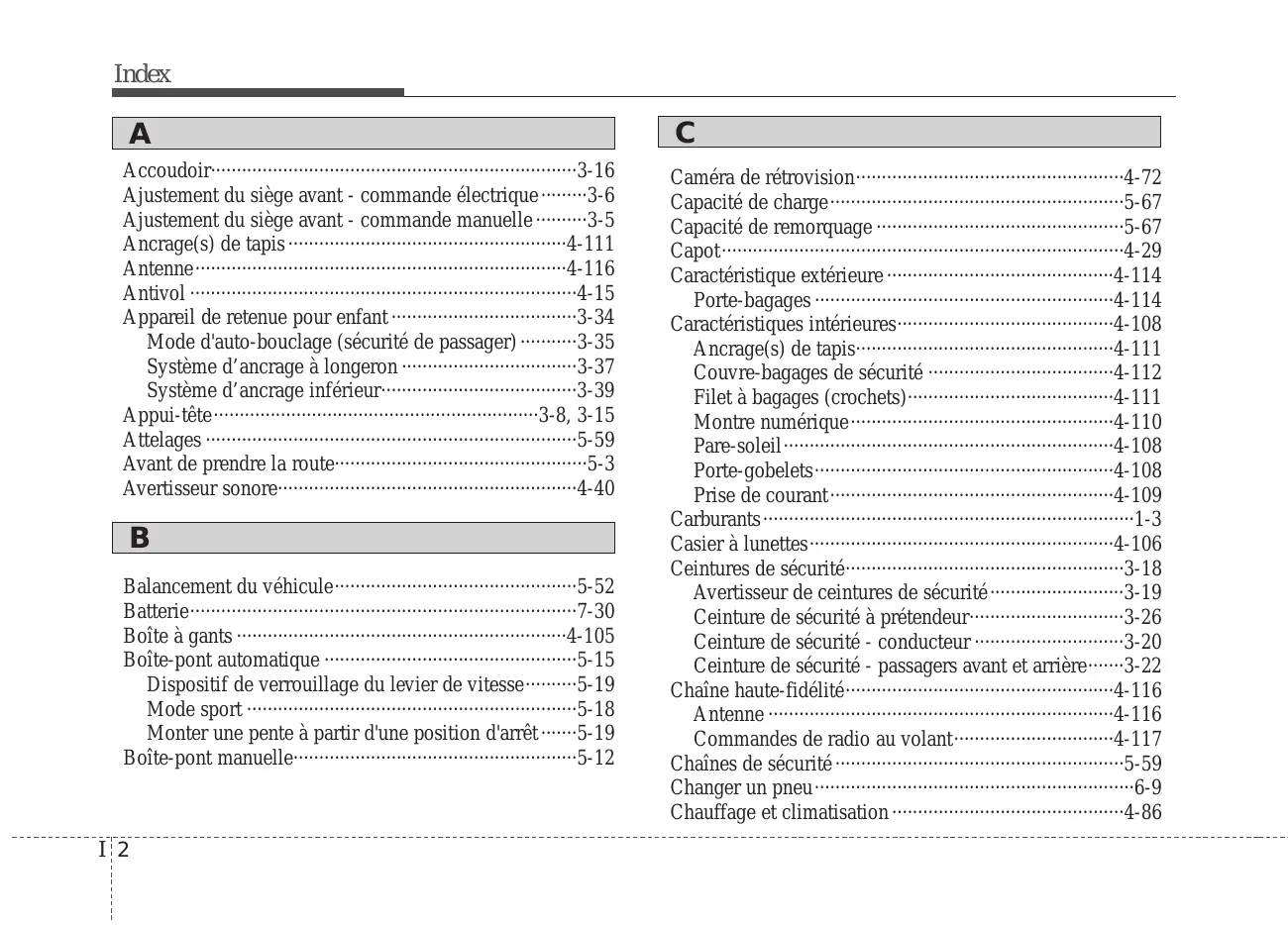 Accoudoir·······································································3-16 Ajustement du siège avant - commande électrique ·········3-6 Ajustement du siège avant - commande manuelle ··········3-5 Ancrage(s) de tapis ······················································4-111 Antenne········································································4-116 Antivol ···········································································4-15 Appareil de retenue pour enfant ····································3-34 Mode d'auto-bouclage (sécurité de passager) ···········3-35 Système d’ancrage à longeron ··································3-37 Système d’ancrage inférieur······································3-39 Appui-tête·······························································3-8, 3-15 Attelages ········································································5-59 Avant de prendre la route·················································5-3 Avertisseur sonore··························································4-40 Caméra de rétrovision····················································4-72 Capacité de charge·························································5-67 Capacité de remorquage ················································5-67 Capot··············································································4-29 Caractéristique extérieure ············································4-114 Porte-bagages ··························································4-114 Caractéristiques intérieures··········································4-108 Ancrage(s) de tapis··················································4-111 Couvre-bagages de sécurité ····································4-112 Filet à bagages (crochets)········································4-111 Montre numérique···················································4-110 Pare-soleil································································4-108 Porte-gobelets··························································4-108 Prise de courant ·······················································4-109 Carburants ········································································1-3 Casier à lunettes···························································4-106 Ceintures de sécurité······················································3-18 Avertisseur de ceintures de sécurité ··························3-19 Ceinture de sécurité à prétendeur······························3-26 Ceinture de sécurité - conducteur ·····························3-20 Ceinture de sécurité - passagers avant et arrière·······3-22 Chaîne haute-fidélité····················································4-116 Antenne ···································································4-116 Commandes de radio au volant·······························4-117 Chaînes de sécurité ························································5-59 Changer un pneu······························································6-9 Chauffage et climatisation ·············································4-86