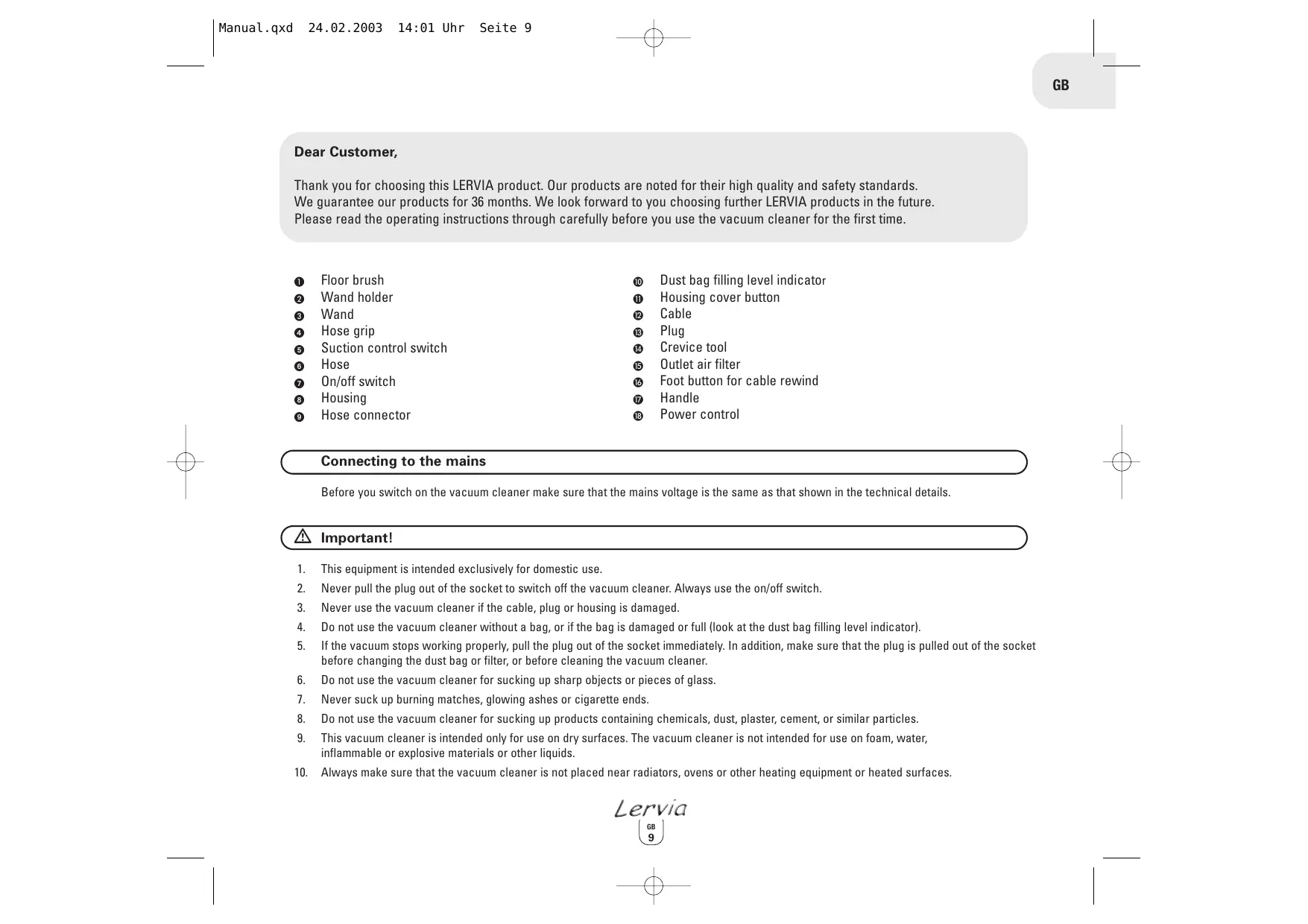 Dear Customer, Thank you for choosing this LERVIA product. Our products are noted for their high quality and safety standards. We guarantee our products for 36 months. We look forward to you choosing further LERVIA products in the future. Please read the operating instructions through carefully before you use the vacuum cleaner for the first time.