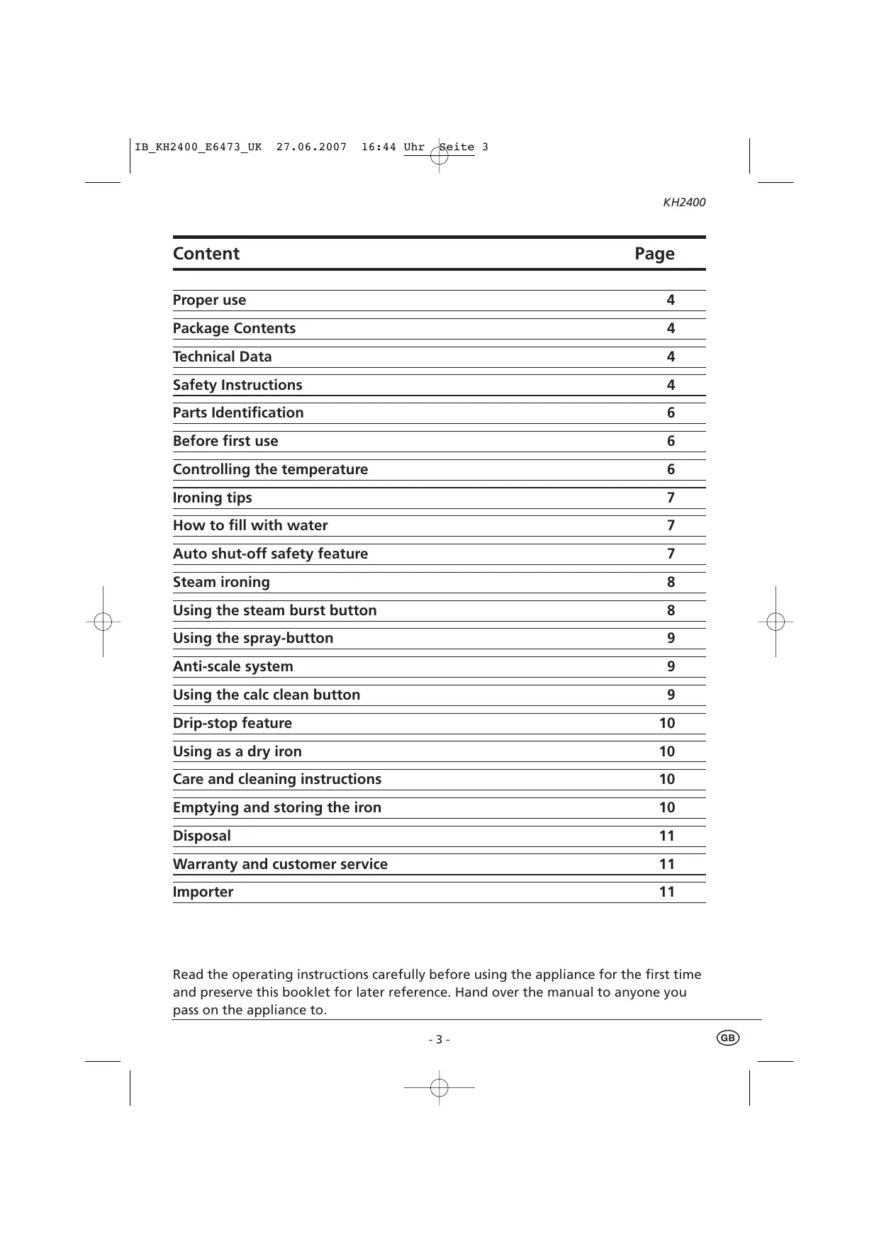 Using as a dry iron Care and cleaning instructions Emptying and storing the iron Disposal Warranty and customer service Importer Read the operating instructions carefully before using the appliance for the first time and preserve this booklet for later reference. Hand over the manual to anyone you pass on the appliance to.