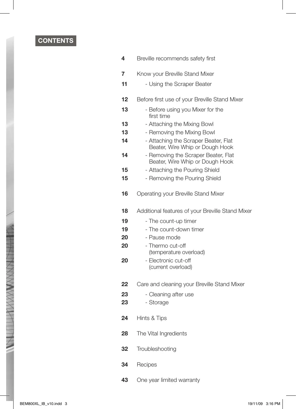 BEM800XL_IB_v10.indd 9 19/11/09 3:16 PM know your breville stand mixer Scrapes the Bowl So you don’t have to Under-mixed batters produce poorly baked results, including collapsing, unevenness of crumb, holes, low rising, streaking and coarse textures. The flexible edge of the Scraper Beater continuously folds and scrapes the sides & bottom of the bowl, including the dimple at the bottom, for exceptionally thorough mixing. It virtually eliminates the need for hand scraping with a spatula, cutting mixing time by up to 60%*.