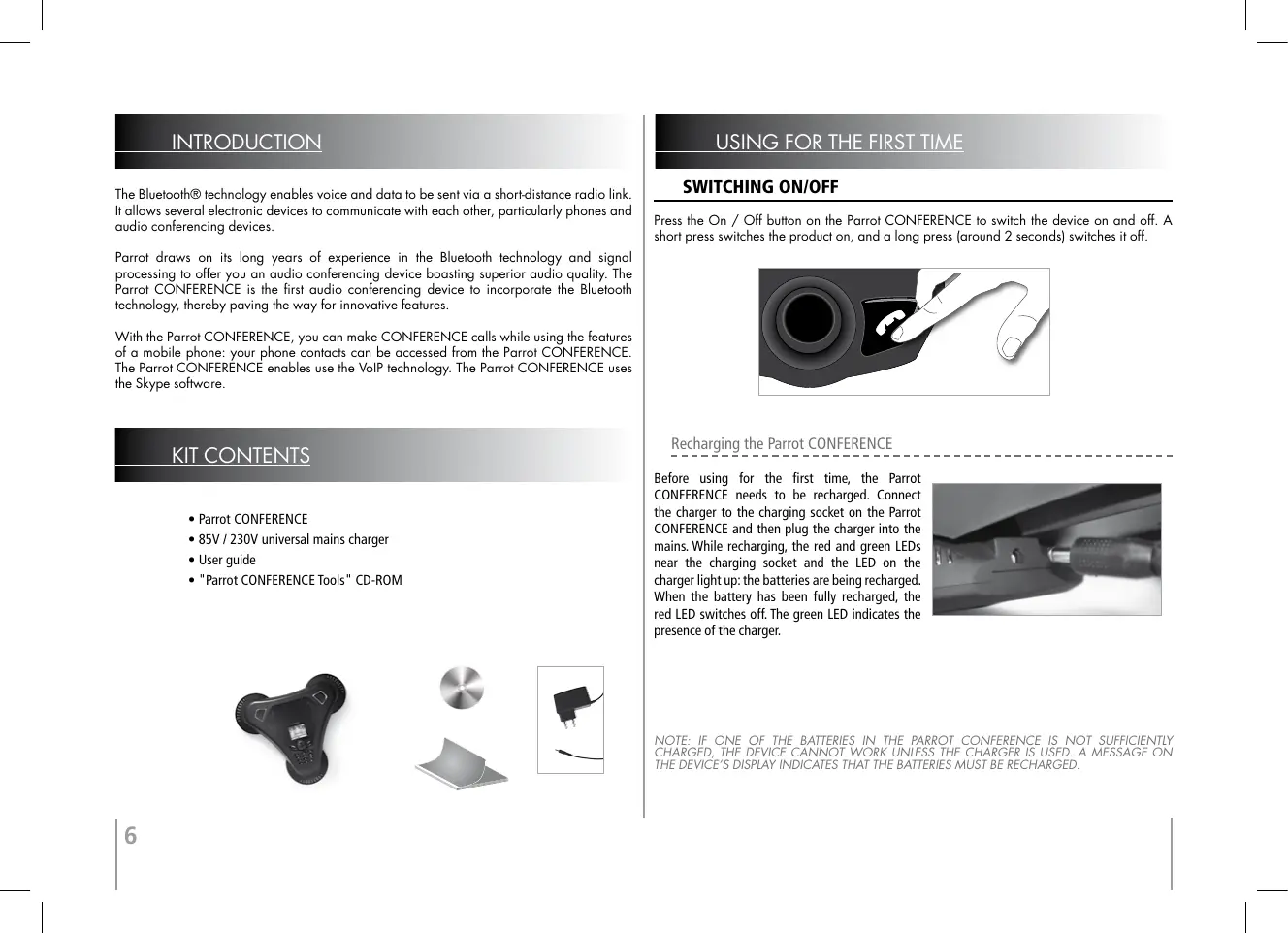 IMPORTANT SAFETY INSTRUCTIONS P Introduction p kit contents using for the first timE p switching on/off P recharging the Parrot CONFERENCE P description of the Parrot CONFERENCE features P using a bluetooth phone P installing the PArrot CONFERENCE P menu structure P configuring the Parrot CONFERENCE P description and use of the features