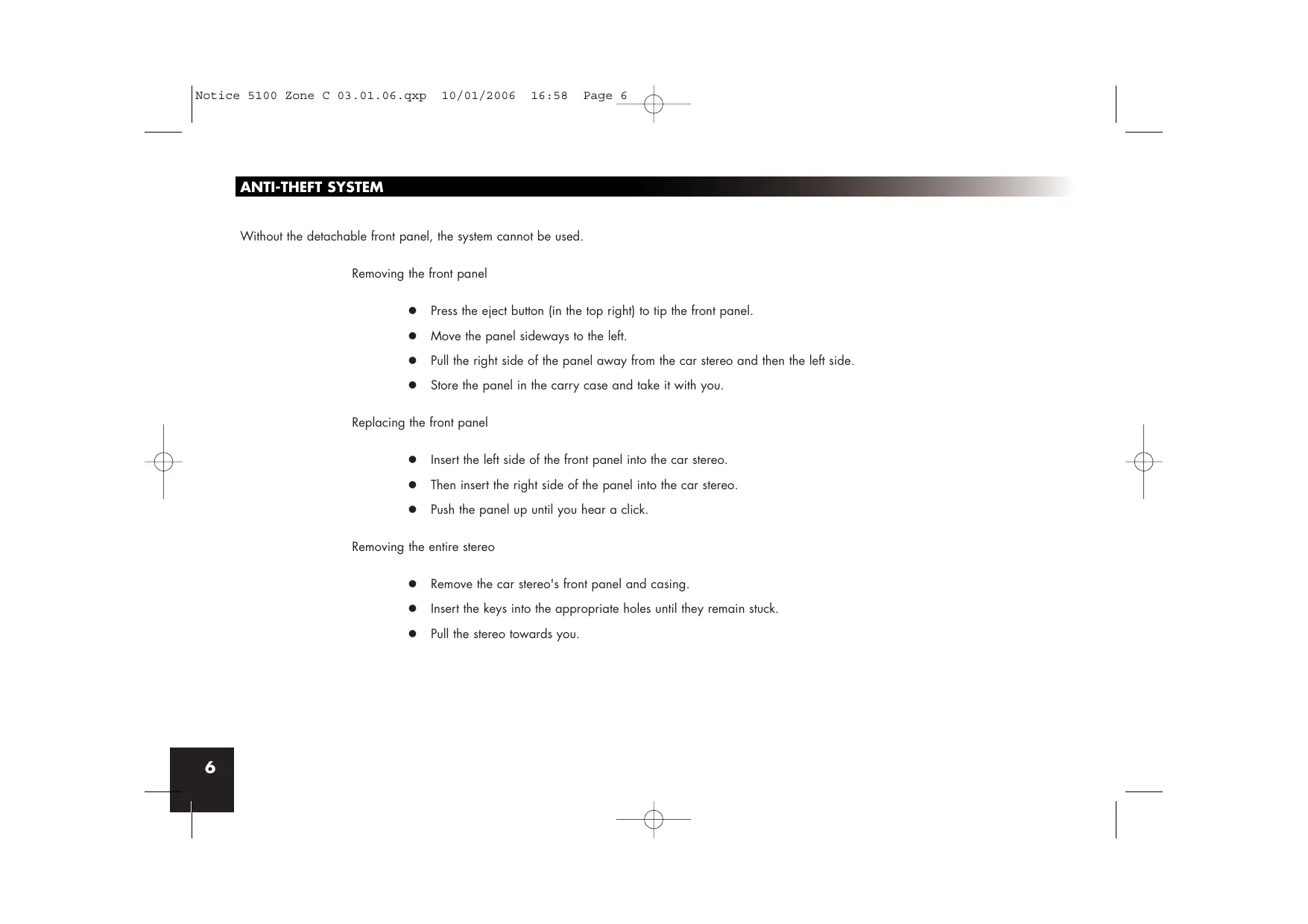 Removing the front panel Press the eject button (in the top right) to tip the front panel. Move the panel sideways to the left. Pull the right side of the panel away from the car stereo and then the left side. Store the panel in the carry case and take it with you. Replacing the front panel Insert the left side of the front panel into the car stereo. Then insert the right side of the panel into the car stereo. Push the panel up until you hear a click. Removing the entire stereo Remove the car stereo's front panel and casing. Insert the keys into the appropriate holes until they remain stuck. Pull the stereo towards you.