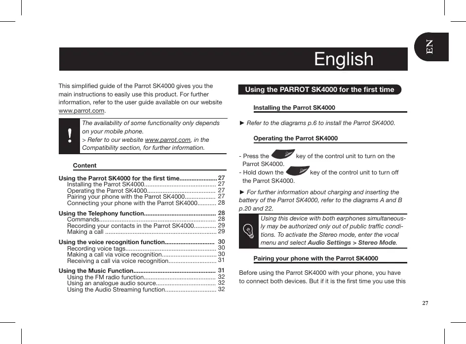 This simplified guide of the Parrot SK4000 gives you the m main instructions to easily use this product. For further