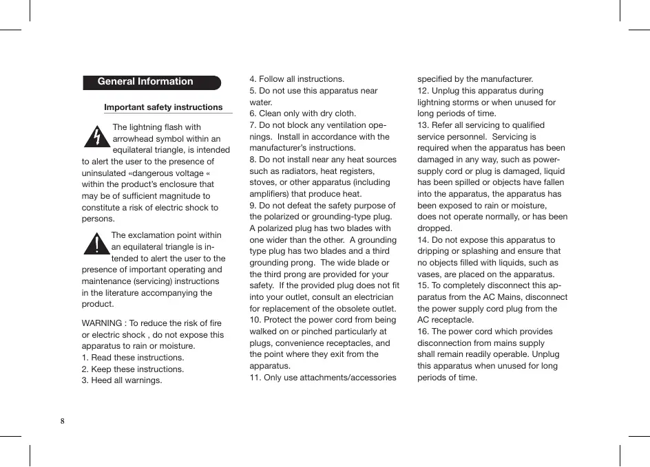 14. N'exposez cet appareil de sorte qu'il ne soit pas exposé à des suinte- ments ou projections de liquides. Ne pas placer d'objets remplis de liquide, comme des vases, sur l'appareil