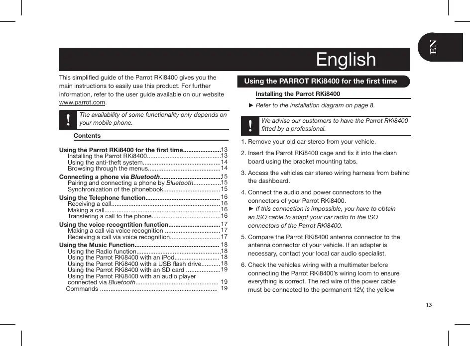 This simplified guide of the Parrot RKi8400 gives you the main instructions to easily use this product. For further information, refer to the user guide available on our website wwviparrot.com The avalabilty of some functionalty only depends on your mobile phone.