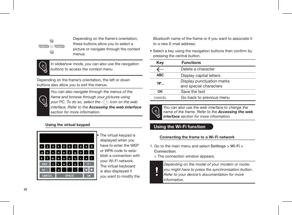 Scrollng through the menus. 09 Using the virtual keypad 10 Using the Wi-Fi” function Comnecting the frame to a Accessing the web interface. 10 Receiving pictures by email 11 Display photo albums on Iiné. 12 Display pictures stored on a compuier. 12