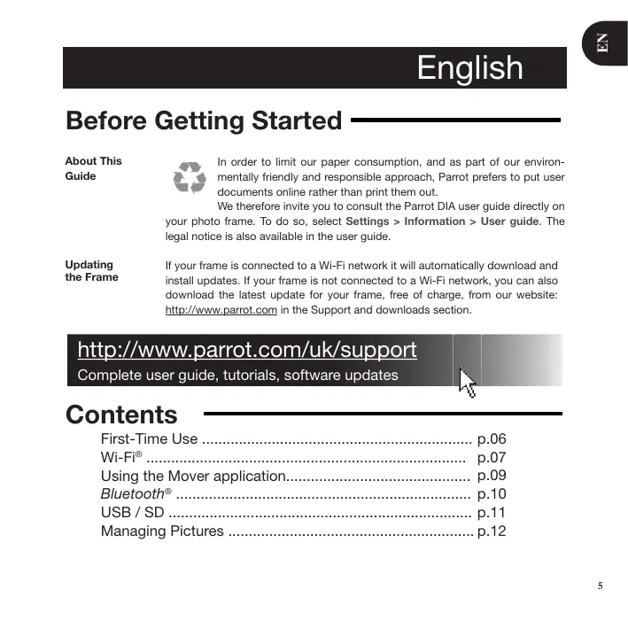Sm@ l'environnement, Parrot privilégie la mise en ligne des documents utlisateurs plutôt que leur impression. Nous vous invitons donc à consuter le guide utilisateur du Parrot DIA directement sur votre cadre photo. Pour cela, sélectionnez Réglages > Informations > Guide utilisateur. Les men-