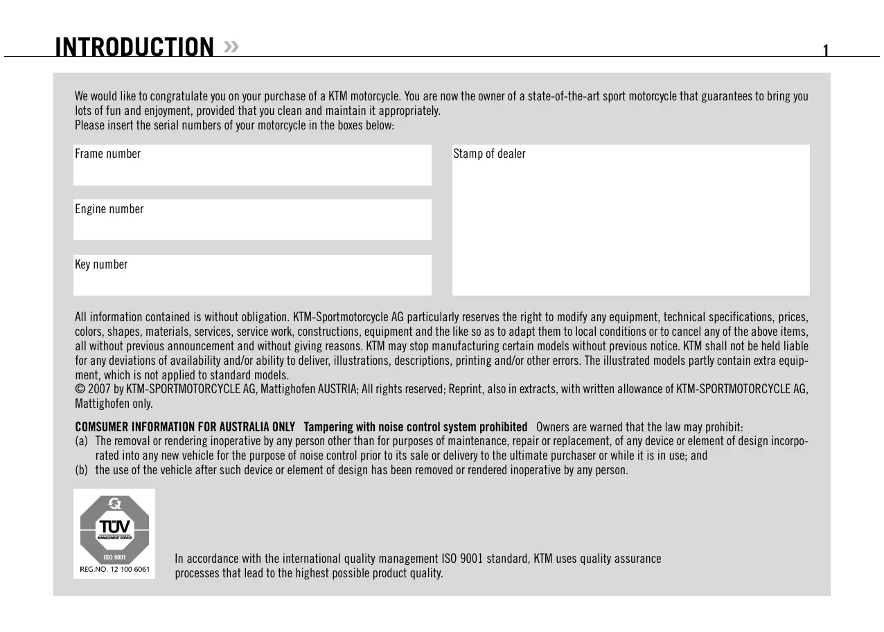 L=4 12/2007 FOTO: MITTERBAUER INTRODUCTION We would like to congratulate you on your purchase of a KTM motorcycle. You are now the owner of a state-of-the-art sport motorcycle that guarantees to bring you lots of fun and enjoyment, provided that you clean and maintain it appropriately. Please insert the serial numbers of your motorcycle in the boxes below: