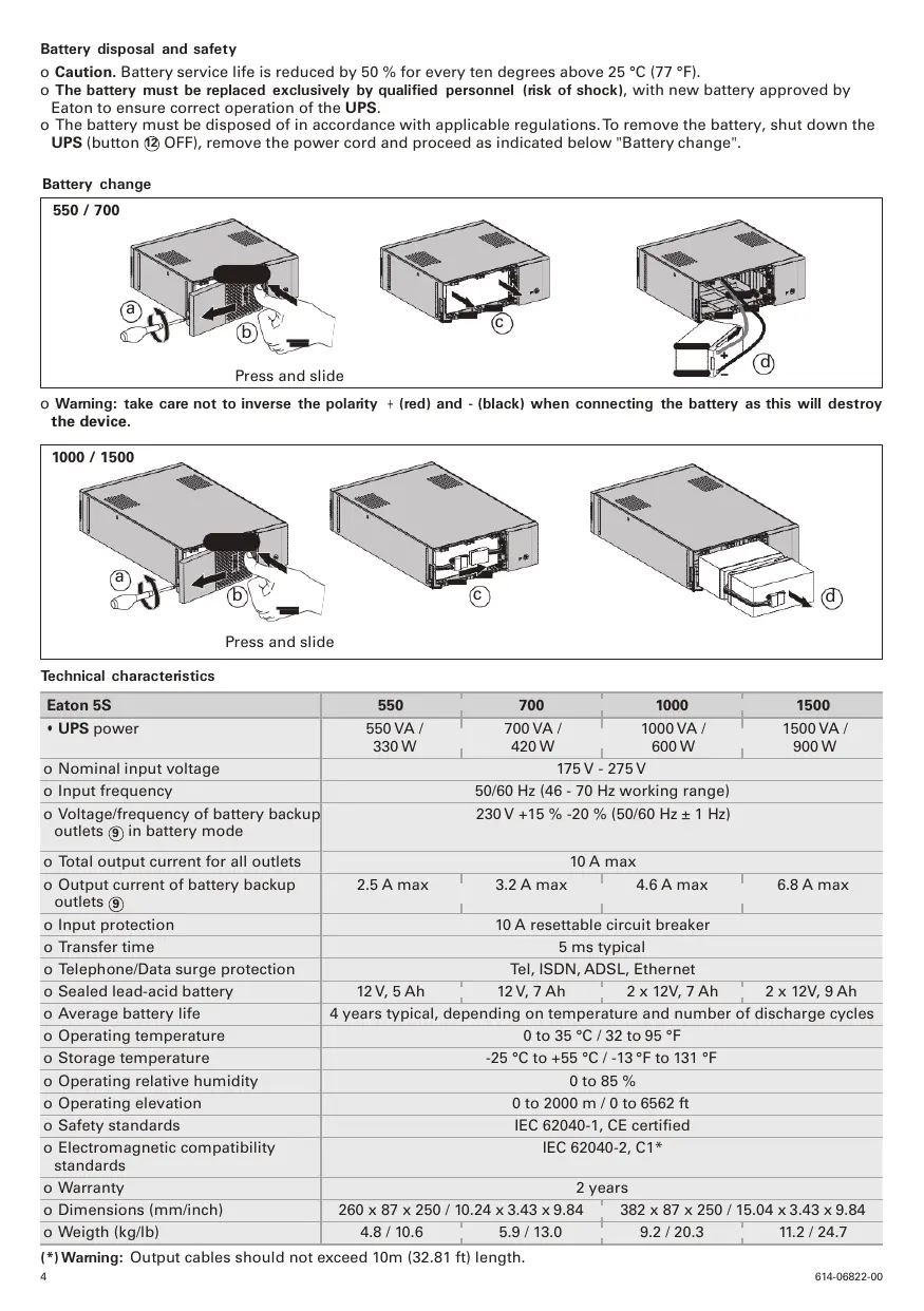 Battery disposal and safety o Caution. Battery service life is reduced by 50 % for every ten degrees above 25 °C (77 °F). o The battery must be replaced exclusively by qualified personnel (risk of shock), with new battery approved by Eaton to ensure correct operation of the UPS. o The battery must be disposed of in accordance with applicable regulations. To remove the battery, shut down the UPS (button 12 OFF), remove the power cord and proceed as indicated below "Battery change". Battery change 550 / 700