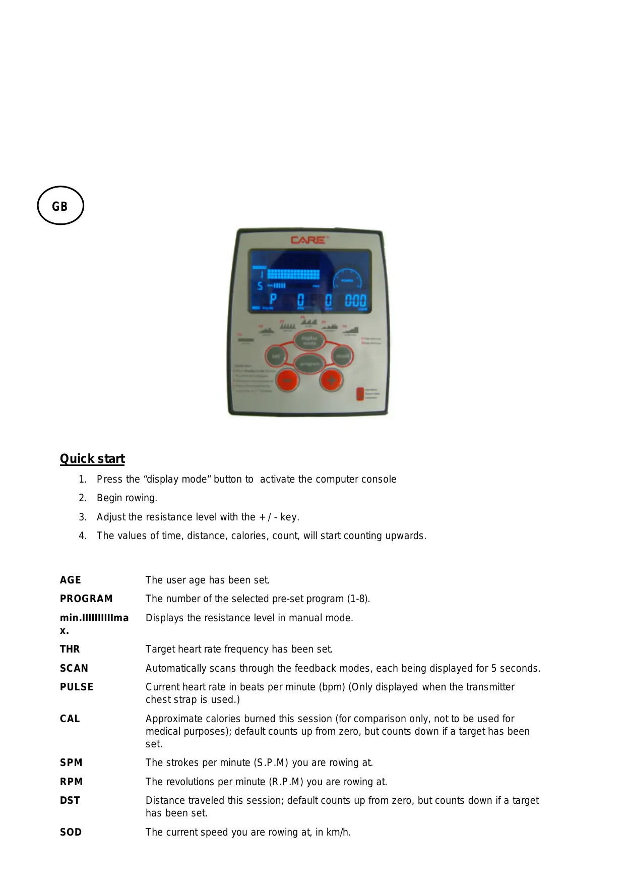 1. Press the “display mode” button to activate the computer console 2. Begin rowing. 3. Adjust the resistance level with the + / - key. 4. The values of time, distance, calories, count, will start counting upwards.