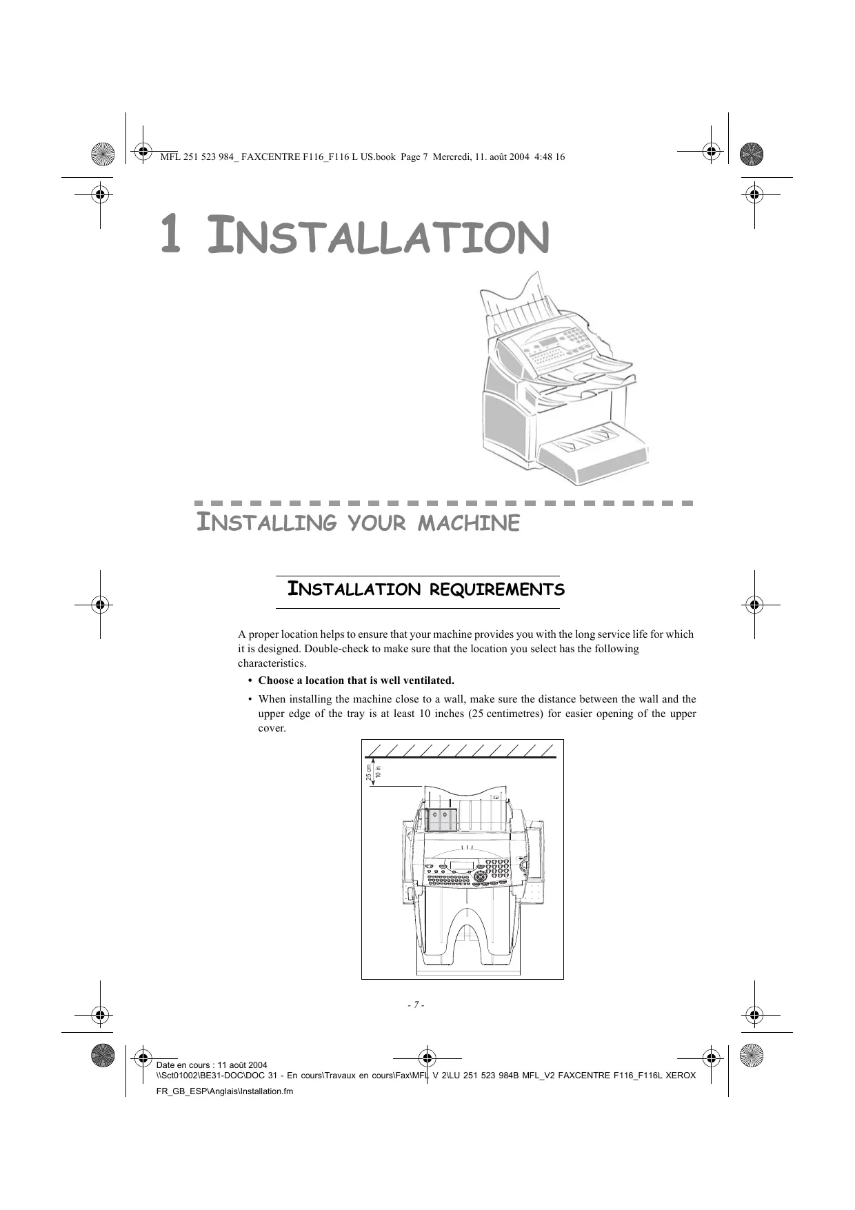 Date en cours : 11 août 2004 \\Sct01002\BE31-DOC\DOC 31 - En cours\Travaux en cours\Fax\MFL V 2\LU 251 523 984B MFL_V2 FAXCENTRE F116_F116L XEROX FR_GB_ESP\Anglais\Installation.fm