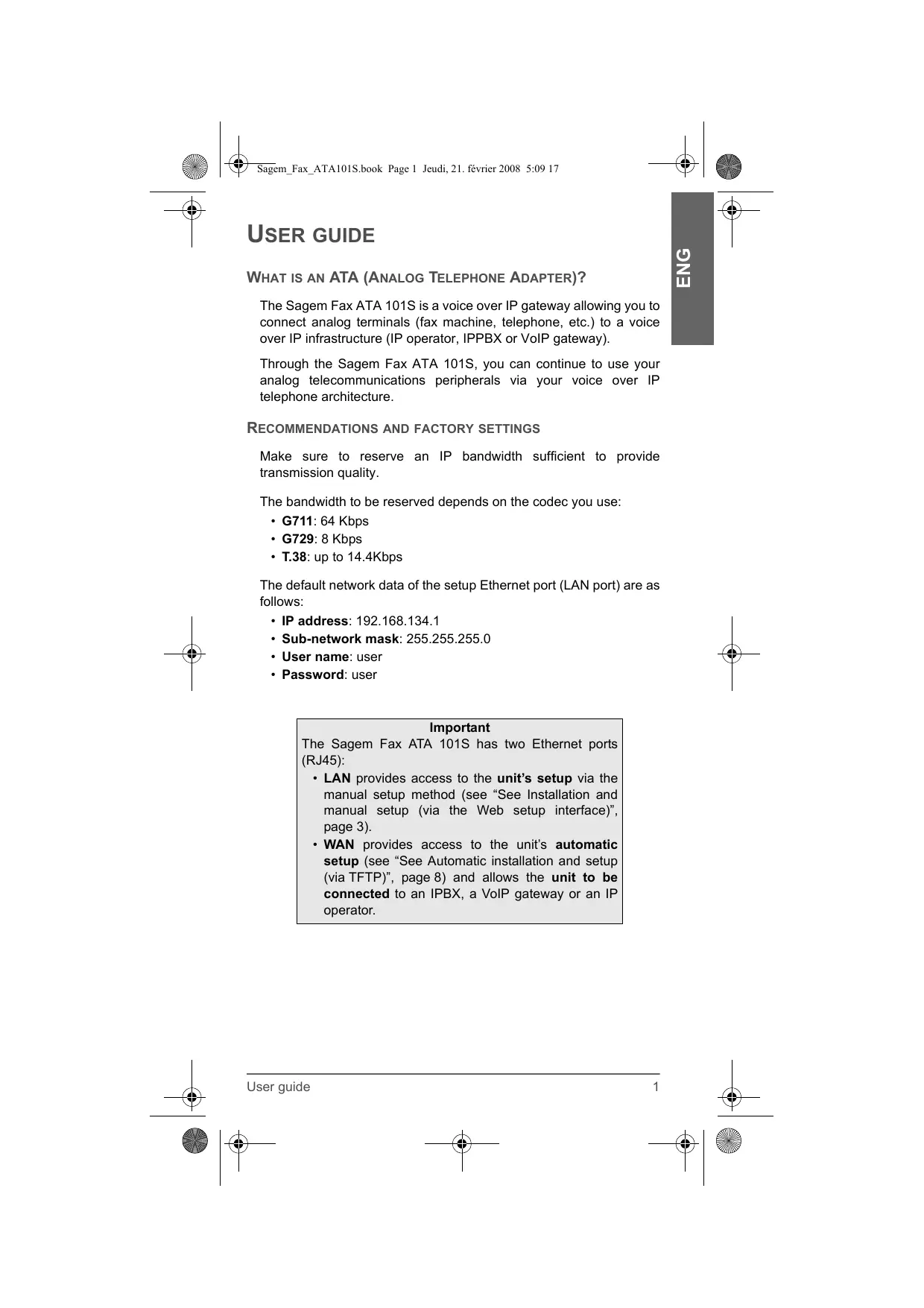 The Sagem Fax ATA 101S is a voice over IP gateway allowing you to connect analog terminals (fax machine, telephone, etc.) to a voice over IP infrastructure (IP operator, IPPBX or VoIP gateway). Through the Sagem Fax ATA 101S, you can continue to use your analog telecommunications peripherals via your voice over IP telephone architecture.