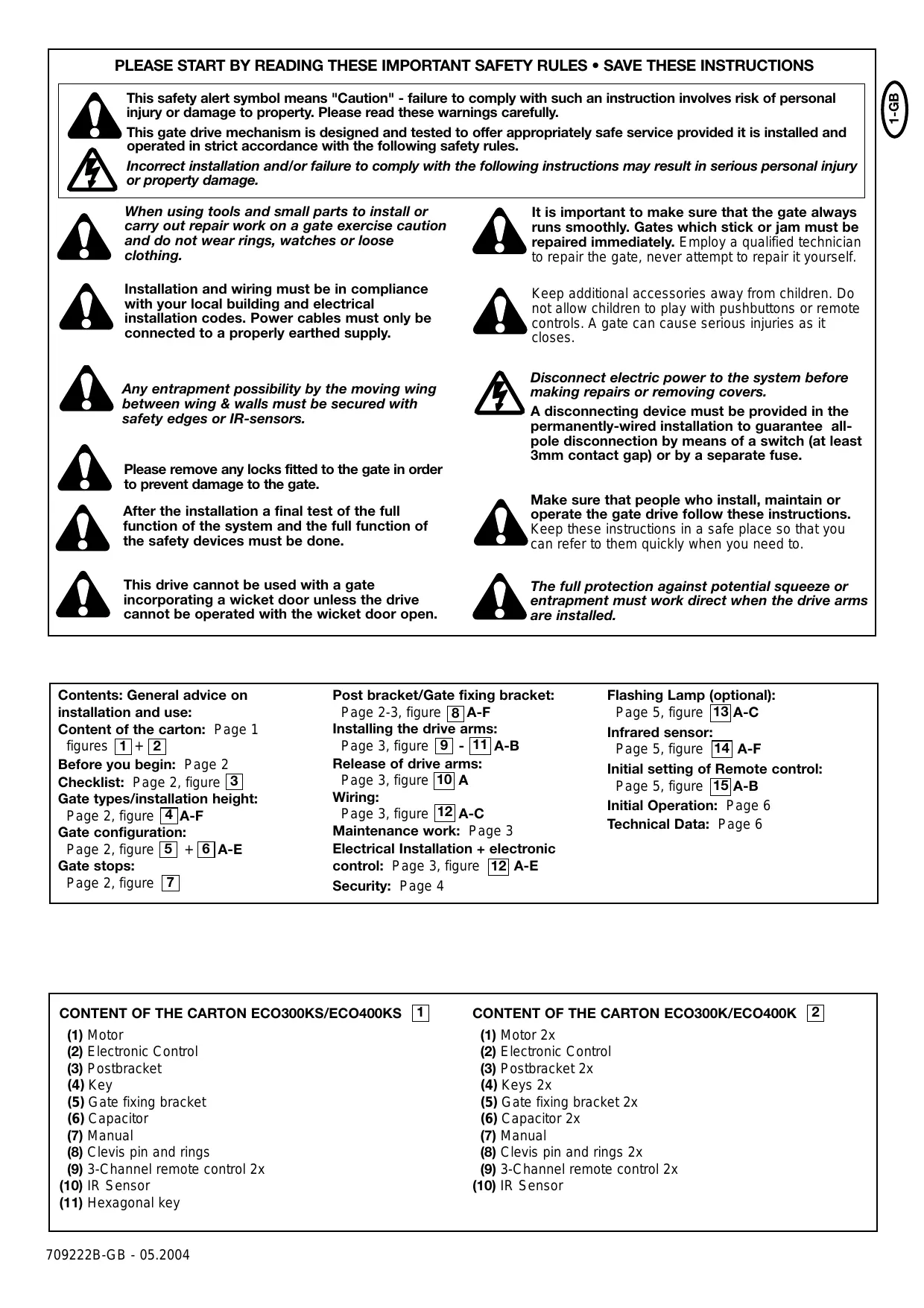 This gate drive mechanism is designed and tested to offer appropriately safe service provided it is installed and operated in strict accordance with the following safety rules. Incorrect installation and/or failure to comply with the following instructions may result in serious personal injury or property damage. When using tools and small parts to install or carry out repair work on a gate exercise caution and do not wear rings, watches or loose clothing.