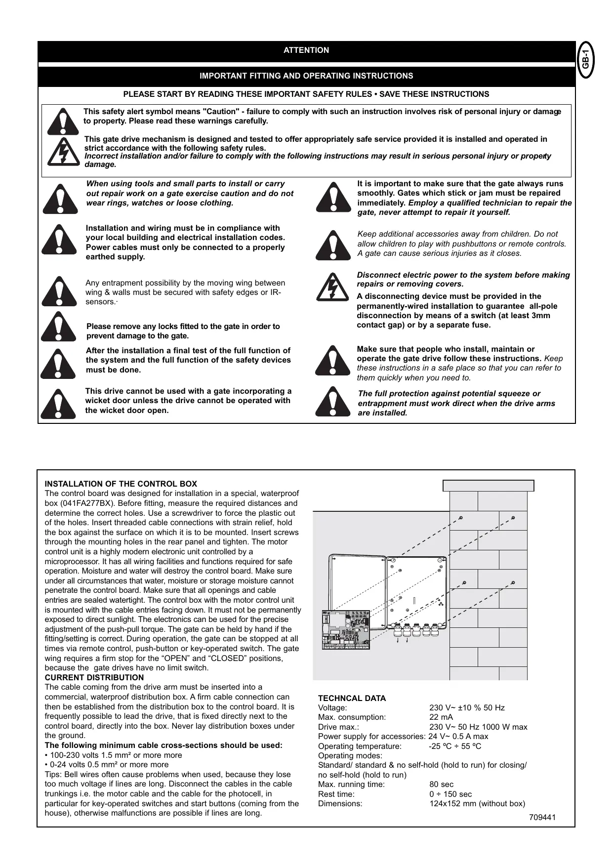 The control board was designed for installation in a special, waterproof box (041FA277BX). Before fitting, measure the required distances and determine the correct holes. Use a screwdriver to force the plastic out of the holes. Insert threaded cable connections with strain relief, hold the box against the surface on which it is to be mounted. Insert screws through the mounting holes in the rear panel and tighten. The motor control unit is a highly modern electronic unit controlled by a microprocessor. It has all wiring facilities and functions required for safe operation. Moisture and water will destroy the control board. Make sure under all circumstances that water, moisture or storage moisture cannot penetrate the control board. Make sure that all openings and cable entries are sealed watertight. The control box with the motor control unit is mounted with the cable entries facing down. It must not be permanently exposed to direct sunlight. The electronics can be used for the precise adjustment of the push-pull torque. The gate can be held by hand if the fitting/setting is correct. During operation, the gate can be stopped at all times via remote control, push-button or key-operated switch. The gate wing requires a firm stop for the “OPEN” and “CLOSED” positions, because the gate drives have no limit switch. CURRENT DISTRIBUTION The cable coming from the drive arm must be inserted into a commercial, waterproof distribution box. A firm cable connection can then be established from the distribution box to the control board. It is frequently possible to lead the drive, that is fixed directly next to the control board, directly into the box. Never lay distribution boxes under the ground. The following minimum cable cross-sections should be used: