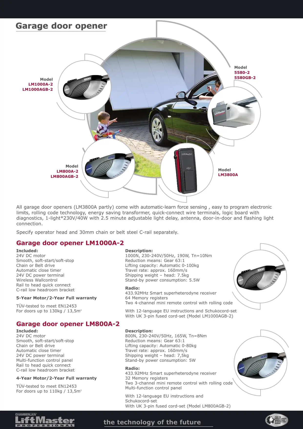 All garage door openers (LM3800A partly) come with automatic-learn force sensing , easy to program electronic limits, rolling code technology, energy saving transformer, quick-connect wire terminals, logic board with diagnostics, 1-light*230V/40W with 2.5 minute adjustable light delay, antenna, door-in-door and flashing light connection.
