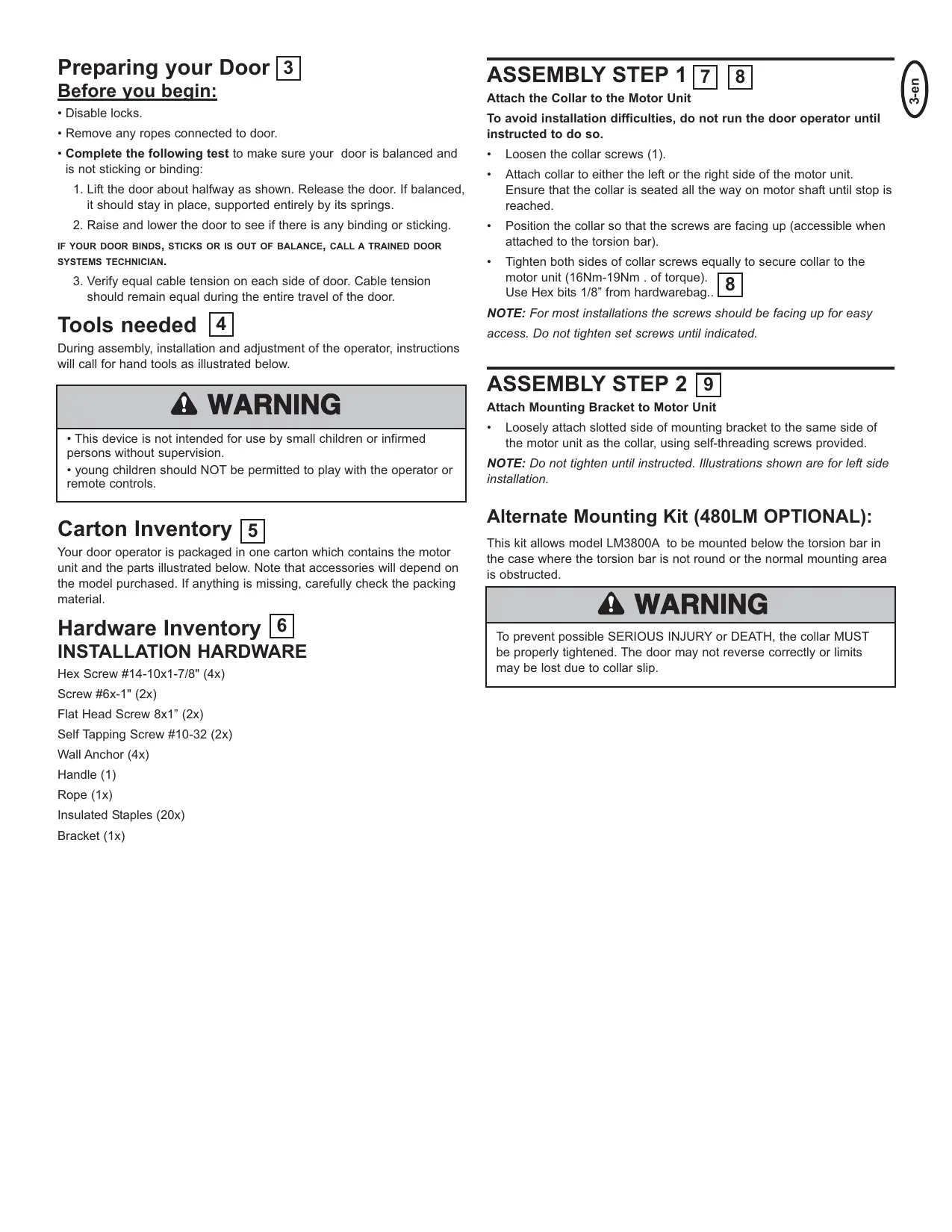 7. Ne pas porter de montre, de bague ou d’habit flottant durant l’installation ou la maintenance. Ceux-ci pourraient être accrochés par la porte ou le mécanisme d’entraînement.