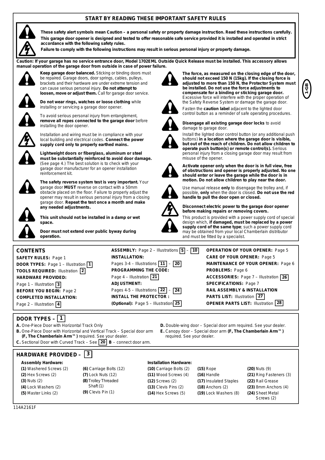 1-GB Caution: If your garage has no service entrance door, Model 1702EML Outside Quick Release must be installed. This accessory allows manual operation of the garage door from outside in case of power failure.