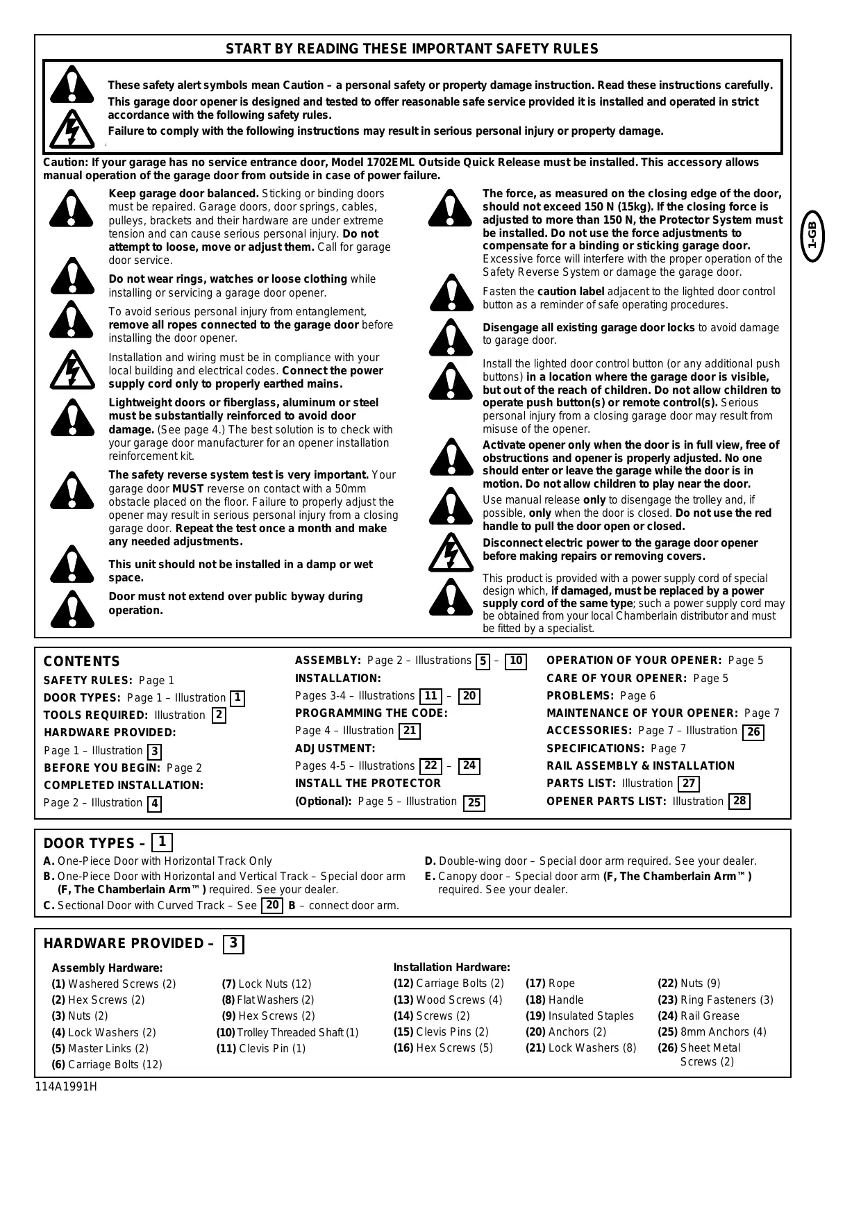 La meilleure solution est de demander à votre fabricant de porte de garage un kit de renforcement pour l’installation d’un ouvre-porte. Le système de contrôle d’inversement de sécurité est très important. Votre porte de garage DOIT inverser son mouvement lorsqu’elle entre en contact avec un obstacle de 50mm placé sur le sol. Un défaut d’ajustage de l’ouvre-porte peut provoquer de sérieuses blessures corporelles lors de la fermeture d’une porte de garage. Refaites le test une fois par mois et effectuez tout ajustage nécessaire. Cet appareil ne doit pas être installé dans un endroit humide ou trempé. La porte ne doit pas s'ouvrir sur le passage public pendant le fonctionnement. TABLE DES MATERES CONSIGNE DE SECURITE: Page 1 TYPES DE PORTE: Page 1 – Figure 1 OUTILS REQUIS: Figure 2 VISSERIE FOURNIE: Page 1 – Figure 3 AVANT DE COMMENCER: Page 2 FIXATION DU RAIL EN "T" ET DU DEROULEUR DE CHAINE – 8