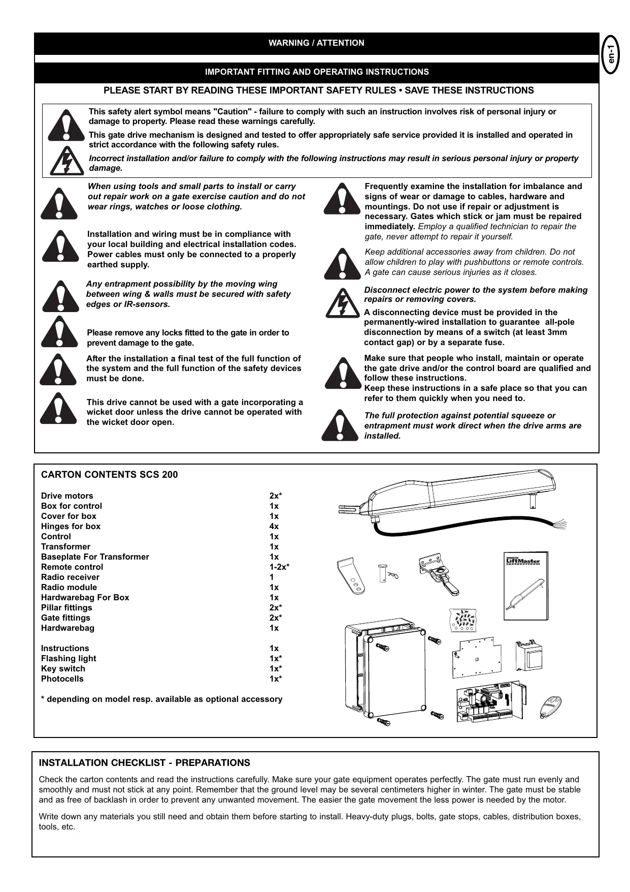 2 1 LISTE DES CONTROLES INSTALLATION - PREPARATIFS Contrôlez le contenu de l'emballage et lisez avec attention les instructions. Assurez-vous du parfait fonctionnement de votre portail. Le portail doit avoir une course régulière et sans à-coups ; il ne doit s’immobiliser à aucun emplacement. N’oubliez pas que le sol peut être relevé de quelques centimètres durant la saison d’hiver. Pour éviter tout mouvement oscillant, le portail doit être posé de façon stable et si possible sans jeu. Plus les battants se manoeuvrent facilement, moins la commande motorisée a besoin de force. Notez quels matériaux vous avez encore besoin et procurez-vous les avant de commencer la pose. Boulons d’ancrage adhésifs (chevilles rigides), vis, butoirs, câbles, boîtes de distribution, outils, etc.