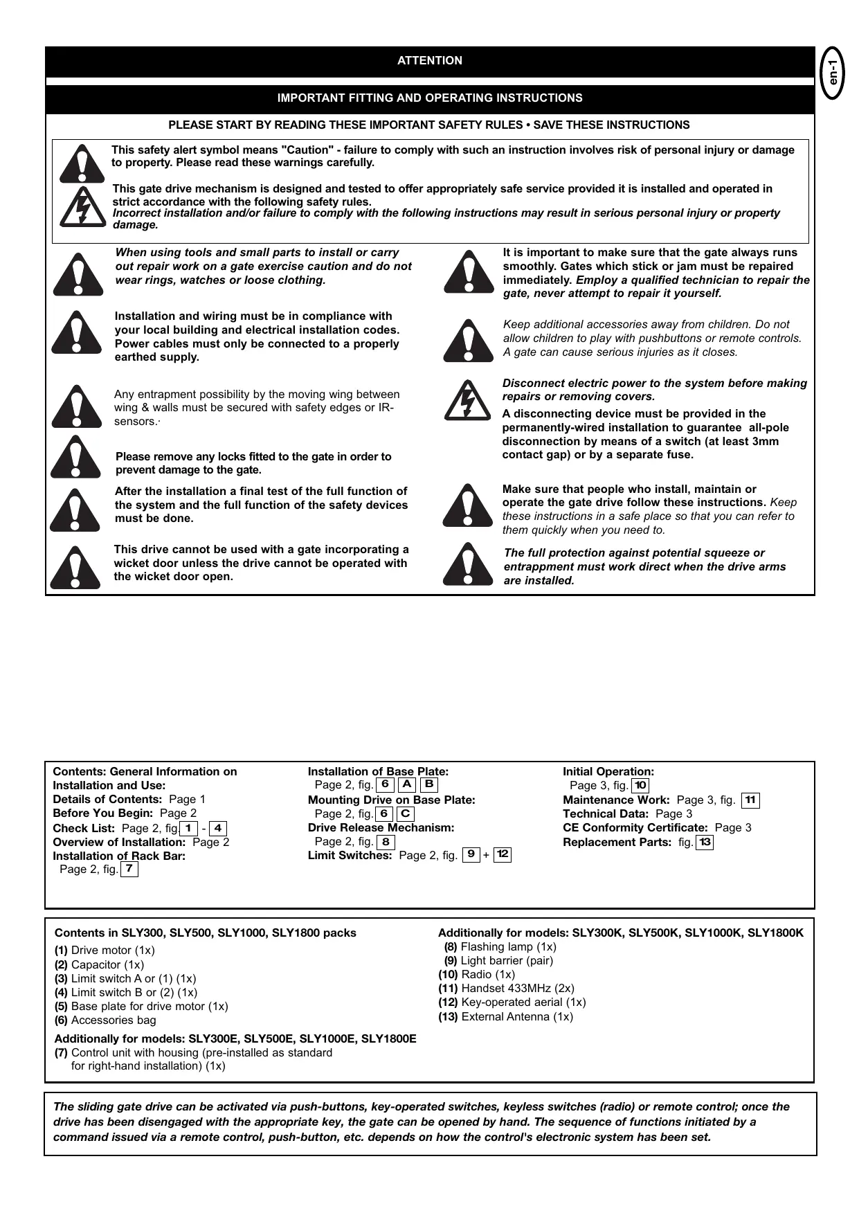 Automatic Gate Opener Models SLY300/E/K, SLY500/E/K, SLY1000/E/K, SLY1800/E/K Series are in conformity to the applicable sections of StandardsEN300220-3 • EN55014 • EN61000-3 • EN60555, EN60335-1 • ETS 300 683 • EN60335-1: 2002 • EN60335-2-103: 2003 • EN55014-1: 2000 + A1 + A2 • EN55014-2: 2001 • EN61000-3-2: 2000 • EN61000-3-3: 1995 + A1 • EN 301 489-3, V1.3.1 • EN 300 220-3 V1.1.1 • EN13241-1 per the provisions & all amendments