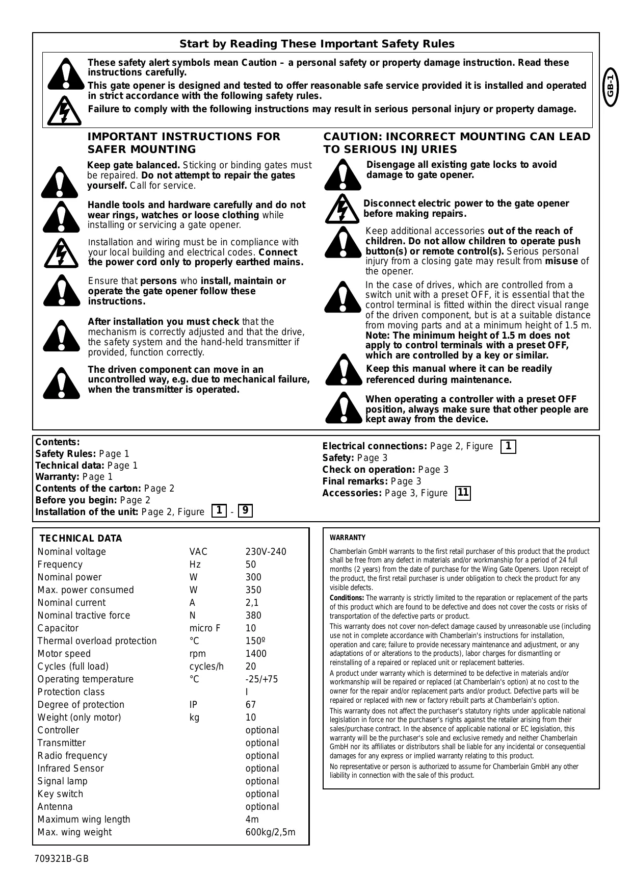 Consigne de Sécurité: Page 1 Caractéristiques techniques: Page 1 Garantie: Page 1 Contenu du coli: Page 2 Avant de commencer: Page 2 Montage de l’Automatisme: Page 2, Figures 1 - 9 CARACTERISTIQUES TECHNIQUES Tension nominale VAC Fréquence Cette garantie ne couvre pas les dommages qui ne sont pas causés par un appareil défectueux et qui résultent d'une utilisation abusive (y compris une utilisation qui n'est pas exactement conforme aux consignes d'installation, de fonctionnement et d'entretien préconisées par Chamberlain GmbH, un manque d'entretien et de réglage nécessaires, toute adaptation ou modification des appareils, tous frais associés au démontage ou à la réinstallation d'une pièce réparée ou changée et au remplacement des piles. Un produit sous garantie dont le défaut de fabrication et/ou de matériel est reconnu sera réparé ou remplacé (au choix de Chamberlain GmbH) sans frais pour le propriétaire en ce qui conceme la réparation ou le remplacement de la pièce défectueuse ou du produit. Les pièces défectueuses seront réparées ou remplacées par des pièces neuves ou réusinées, au choix de Chamberlain GmbH. Cette garantie n'affecte pas les droits statutaires de l'acheteur sous la législation nationale applicable en vigueur. Cette garantie n'affecte pas non plus les droits de l'acheteur à l'égard du revendeur conformément aux termes du contrat de vente/achat. En l'absence de législation nationale ou CE applicable, cette garantie constituera le seul recours exclusif de I'acheteur et, dans le cadre de toute garantie expresse ou implicite concernant ce produit, ni Chamberlain ni ses associés ou distributeurs ne seront responsables de tous dommages accidentels ou relationnels. Aucune personne n'est mandatée ni autorisée par Chamberlain GmbH à assumer quelqu'autre responsabilité en liaison avec la vente de ce produit.