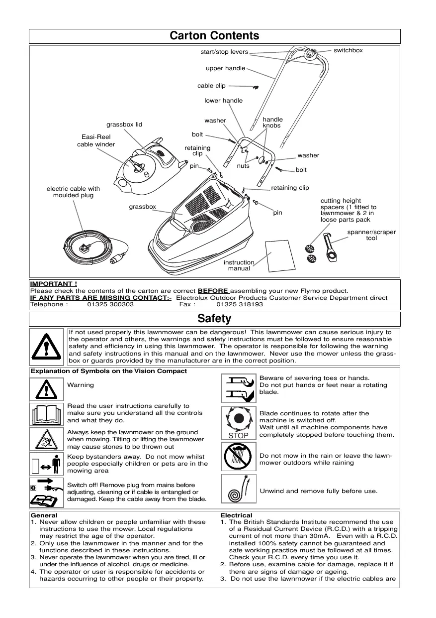 Please check the contents of the carton are correct BEFORE assembling your new Flymo product. IF ANY PARTS ARE MISSING CONTACT: Electrolux Outdoor Products Customer Service Department direct Telephone : 01325 300303 Fax : 01325 318193