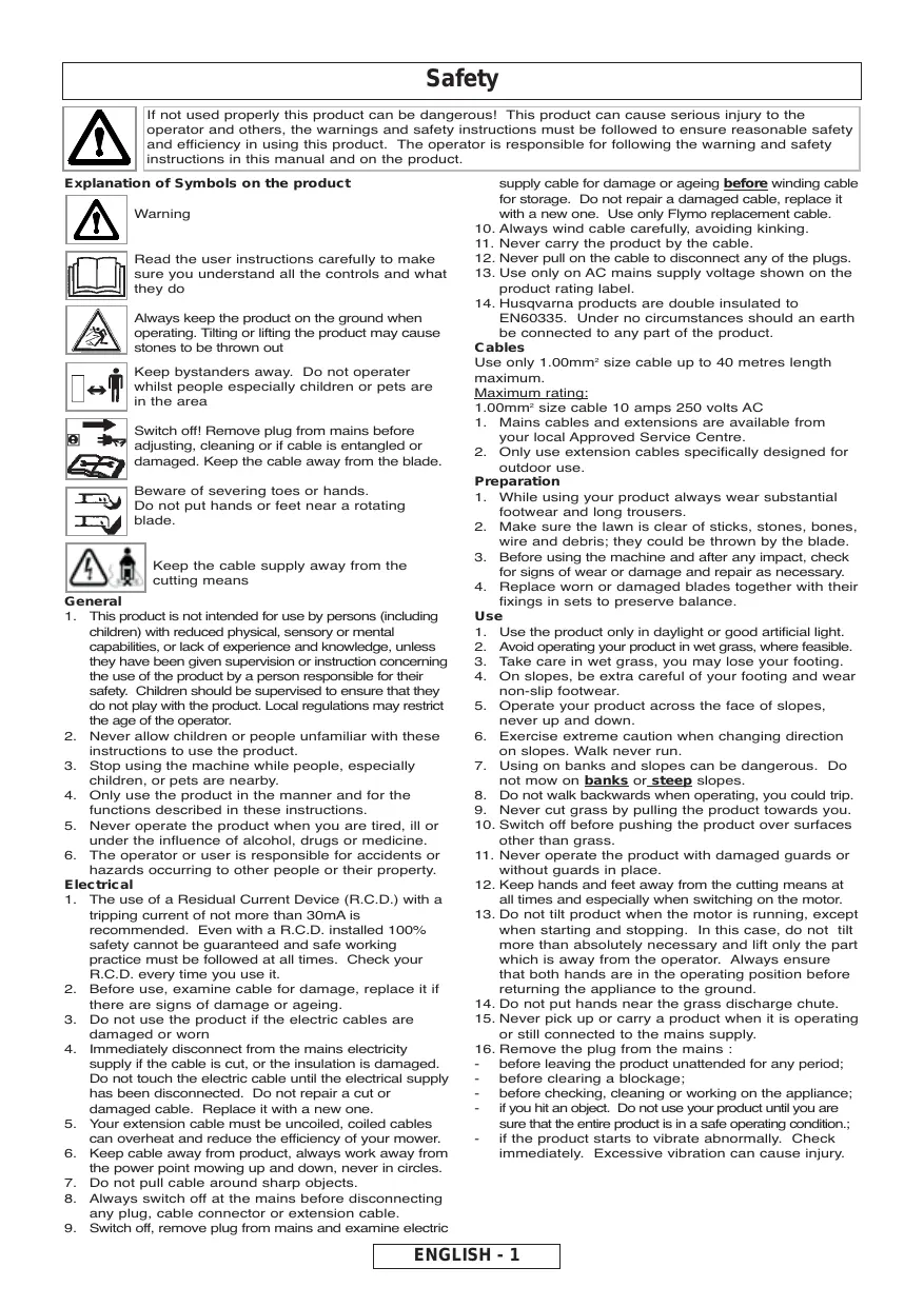 Safety If not used properly this product can be dangerous! This product can cause serious injury to the operator and others, the warnings and safety instructions must be followed to ensure reasonable safety and efficiency in using this product. The operator is responsible for following the warning and safety instructions in this manual and on the product. Explanation of Symbols on the product Warning Read the user instructions carefully to make sure you understand all the controls and what they do Always keep the product on the ground when operating. Tilting or lifting the product may cause stones to be thrown out Keep bystanders away. Do not operater whilst people especially children or pets are in the area Switch off! Remove plug from mains before adjusting, cleaning or if cable is entangled or damaged. Keep the cable away from the blade. Beware of severing toes or hands. Do not put hands or feet near a rotating blade. Keep the cable supply away from the cutting means General