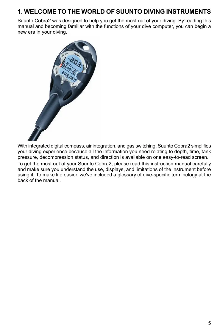 Suunto Cobra2 was designed to help you get the most out of your diving. By reading this manual and becoming familiar with the functions of your dive computer, you can begin a new era in your diving. With integrated digital compass, air integration, and gas switching, Suunto Cobra? simplifies your diving experience because all the information you need relating to depth, time, tank pressure, decompression status, and direction is available on one easy-to-read screen. To get the most out of your Suunto Cobra2, please read this instruction manual carefully and make sure you understand the use, displays, and limitations of the instrument before using it. To make life easier, we‘ve included a glossary of dive-specific terminology at the back of the manual.