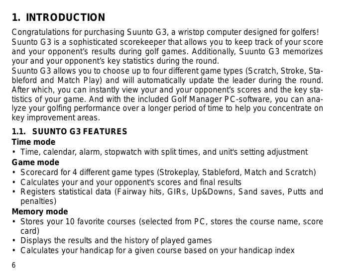 Congratulations for purchasing Suunto G3, a wristop computer designed for golfers! Suunto 63 is a sophisticated scorekeeper that allows you to keep track of your score and your opponents results during golf games. Additionally, Suunto G3 memorizes your and your opponents key statistics during the round. Suunto 63 allows you to choose up to four different game types (Scratch, Stroke, Sta- bleford and Match Play) and will automatically update the leader during the round. After which, you can instant}y view your and your opponents scores and the key sta- tistics of your game. And with the included Golf Manager PC-sofiware, you can ana- Iyze your goffing performance over a longer period of time to help you concentrate on Key improvement areas.