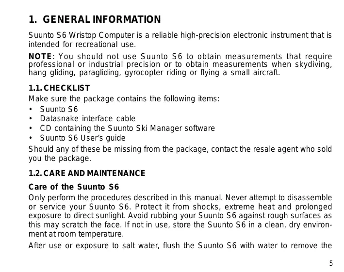 Suunto S6 Wristop Computer is a reliable high-precision electronic instrument that is intended for recreational use. NOTE: You should not use Suunto S6 to obtain measurements that require professional or industrial precision or to obtain measurements when skydiving, hang gliding, paragliding, gyrocopter riding or flying a small aircraft. 1.1. CHECKLIST Make sure the package contains the following items: