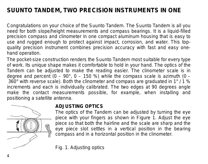 SUUNTO TANDEM, TWO PRECISION INSTRUMENTS IN ONE Congratulations on your choice of the Suunto Tandem. The Suunto Tandem is all you need for both slope/height measurements and compass bearings. It is a liquid-filled precision compass and clinometer in one compact aluminum housing that is easy to use and rugged enough to protect against impact, corrosion, and water. This topquality precision instrument combines precision accuracy with fast and easy onehand operation. The pocket-size construction renders the Suunto Tandem most suitable for every type of work. Its unique shape makes it comfortable to hold in your hand. The optics of the Tandem can be adjusted to make the reading easier. The clinometer scale is in degree and percent (0 – 90°, 0 – 150 %) while the compass scale is azimuth (0 – 360° with reverse scale). Both the clinometer and compass are graduated in 1° / 1 % increments and each is individually calibrated. The two edges at 90 degrees angle make the contact measurements possible, for example, when installing and positioning a satellite antenna. ADJUSTING OPTICS The optics of the Tandem can be adjusted by turning the eye piece with your fingers as shown in Figure 1. Adjust the eye piece so that both the hairline and the scale are sharp and the eye piece slot settles in a vertical position in the bearing compass and in a horizontal position in the clinometer. Fig. 1. Adjusting optics